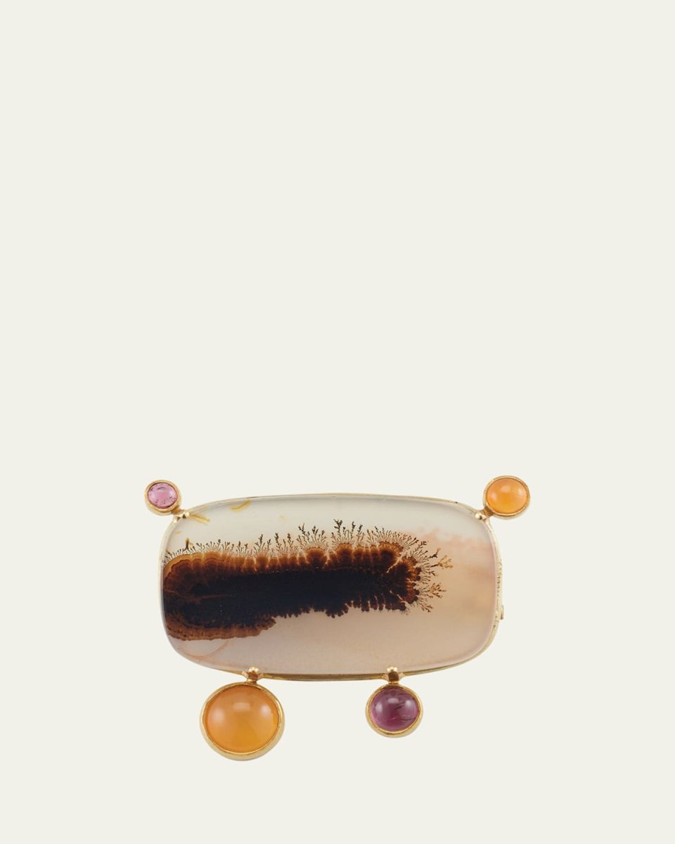 Dendritic Agate, Pink Tourmaline, and Carnelian Pin in 18K Yellow Gold