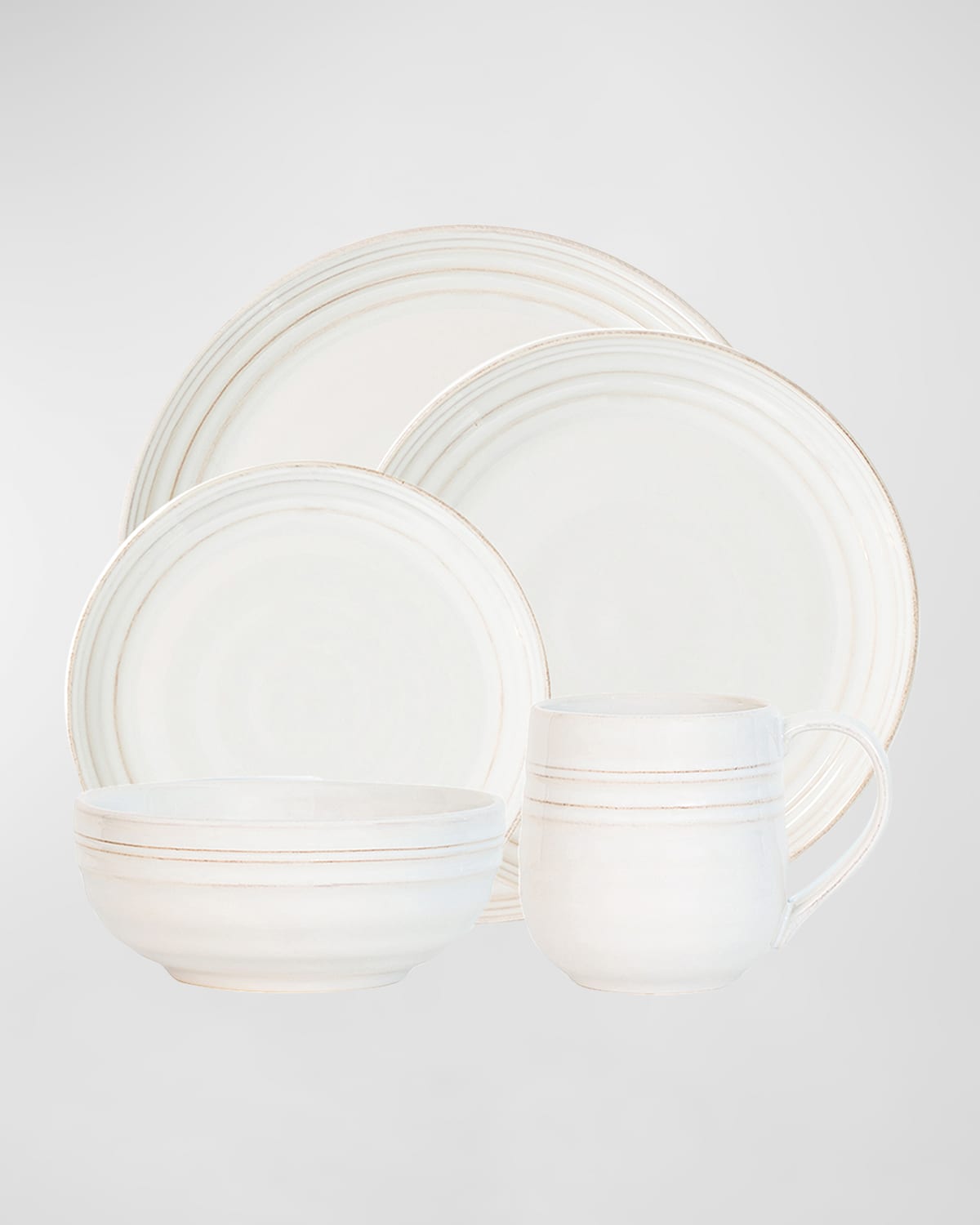Made of ceramic and stoneware Approx. 12"Dia. x 5.5"T Set of five Includes one of each: dinner plates, dessert plates, bowls, and mugs Dishwasher, microwave, and oven safe Made in Portugal