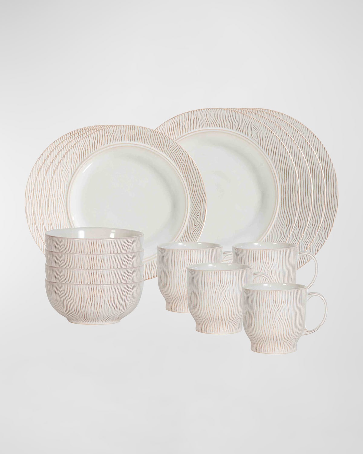 Inspired by the oldest grove of oak trees in England's Blenheim Park, this woodgrain textured collection is rendered in a fresh and peaceful palette of creams and warm browns, with our signature whitewash glaze and a patina to highlight the beautifully rich motif. Equally idyllic and chic, this versatile dinnerware flourishes yearround, and layers easily with many other Juliska patterns. Dinnerware set is made of stoneware Includes four of each: cereal bowl, dinner plate, salad plate, and mug Approx. 11"Dia. x 1"T Item Weight (Lbs.): 25.0 16piece set Dishwasher, microwave, and oven safe Made in Portugal
