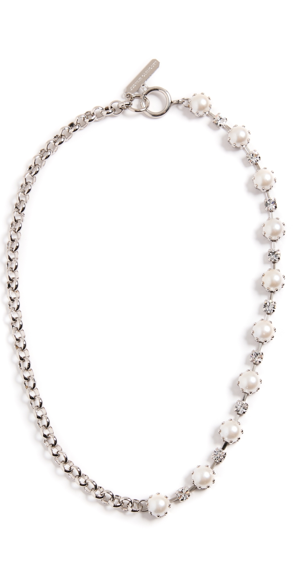 Imitation pearls and crystal accents. Brass. Ring clasp. Made in France. Measurements: Length: 15.75in / 40.0cm