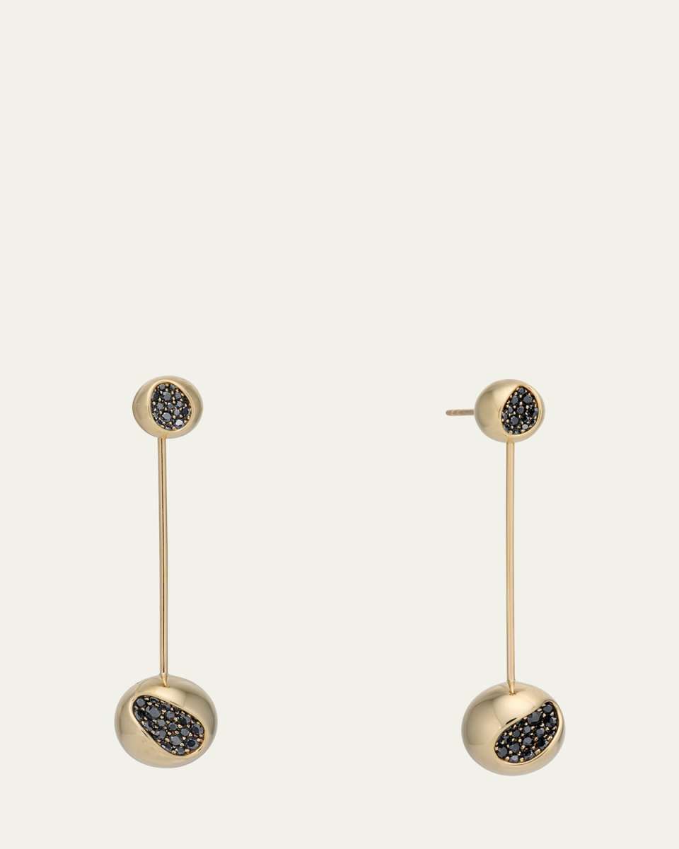 JV INSARDI earrings from the SOLAR collection swing left to right with pavéset black sapphires Approx. 50mm long Polished 18karat yellow gold 2.46 total sapphire carat weight For pierced ears Made in USA