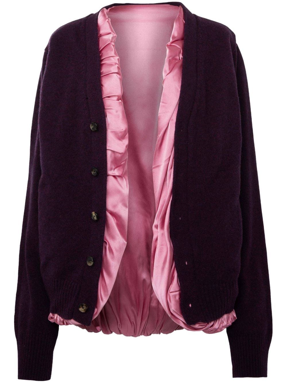 plum purple/rose pink wool fine knit signature JW-initials anchor logo gathered detailing front button fastening long sleeves ribbed cuffs and hem contrasting satin lining