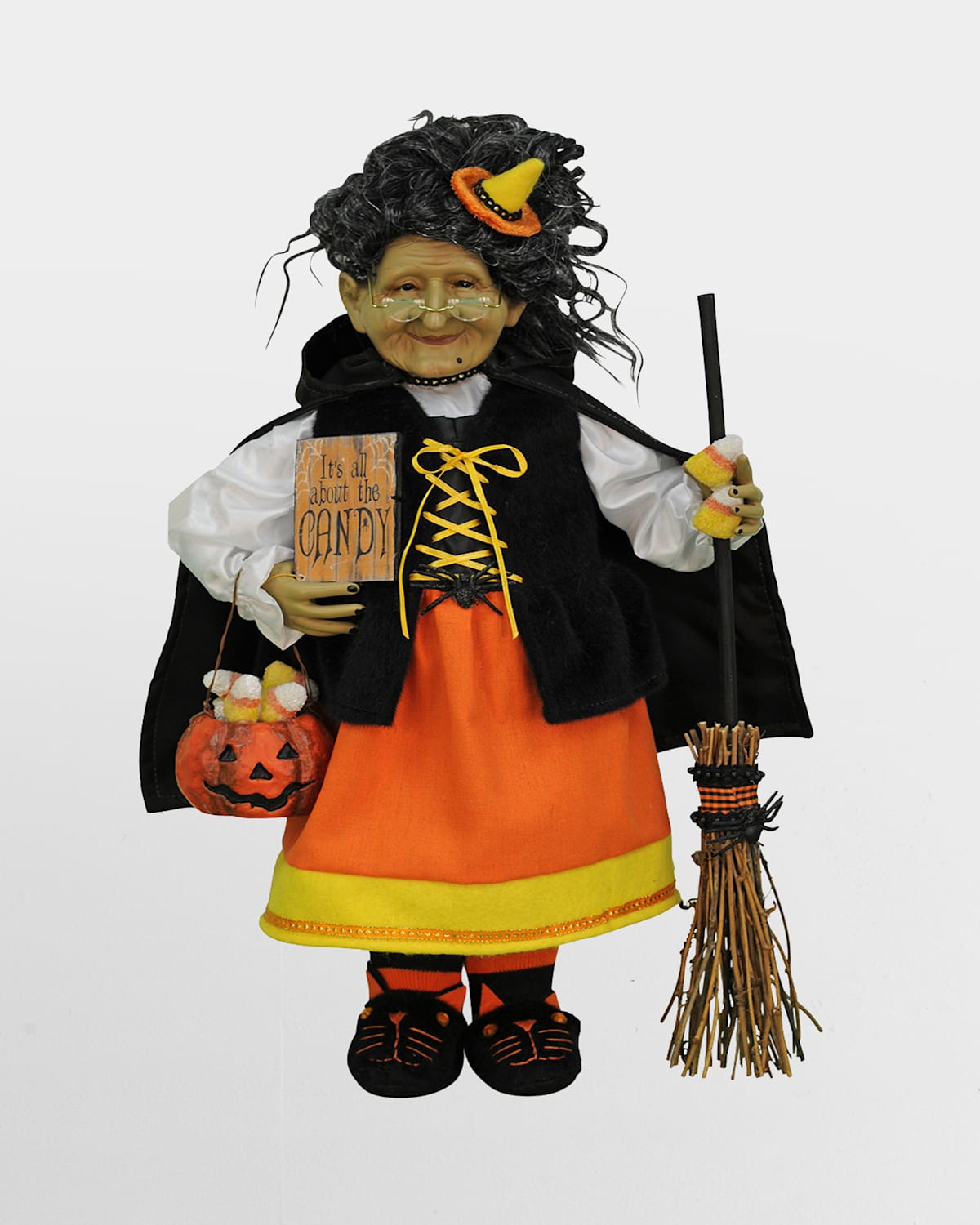 "Candy Corn" witch collectible. Polyresin/plastic/wood/foam/cotton/metal. 12"W x 6"D x 19"T. Imported.