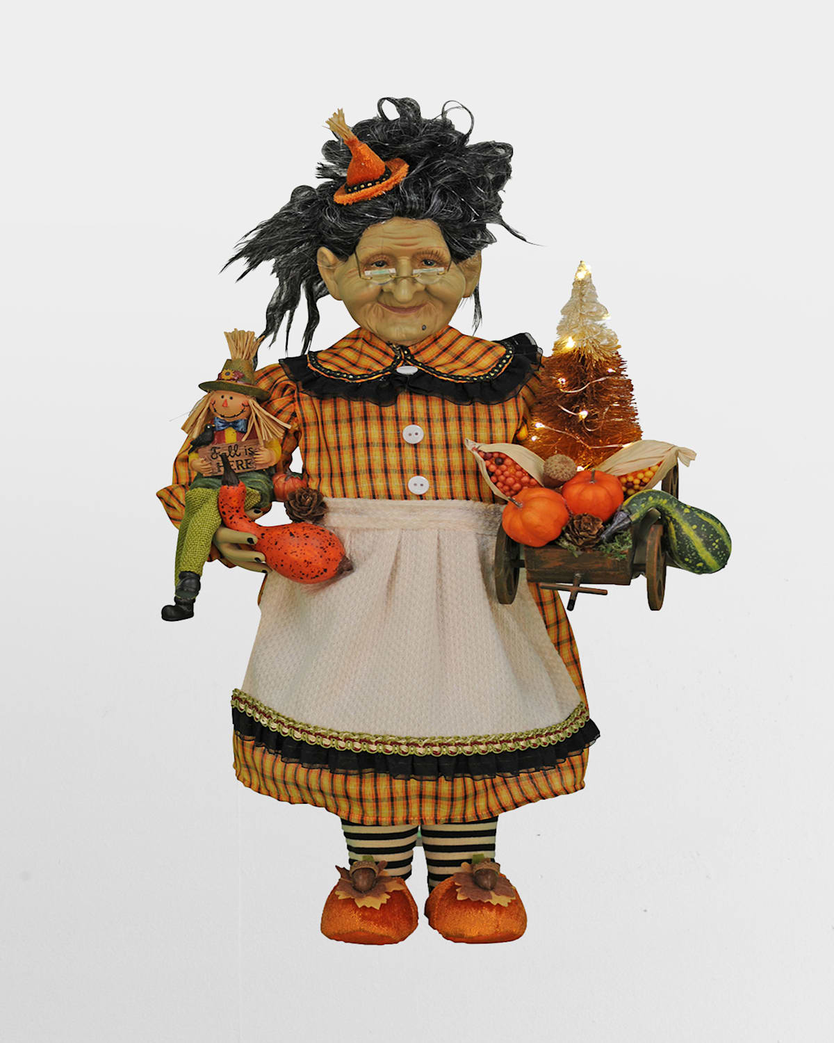 "Fall Harvest" lighted witch collectible. Polyresin/plastic/wood/foam/cotton/metal. 12"W x 7"D x 21"T. Imported.