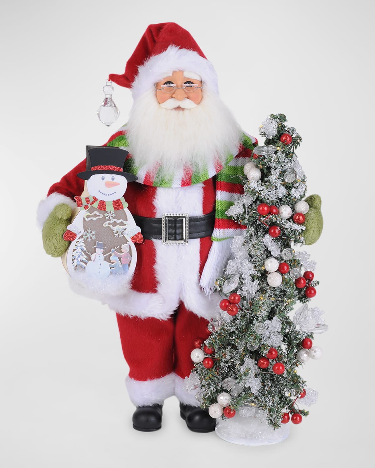 The quality is unmatched with this decorative piece's handpainted face, inset eyes, unique fabric, and detailed accessories. With its primitive touch, winter weather fun design, beautifully lit tree, and snowman sign it's sure to add character and style to any home. Great for any shelf, mantle, or countertop Handcrafted of polyester, faux fur (polyester), polyresin, and PVC Battery operated; requires two AA and three LR34/AG13 button batteries (not included) Approx. 12"L x 7"W x 17"T Item Weight (Lbs.): 3.0 Wipe clean Imported