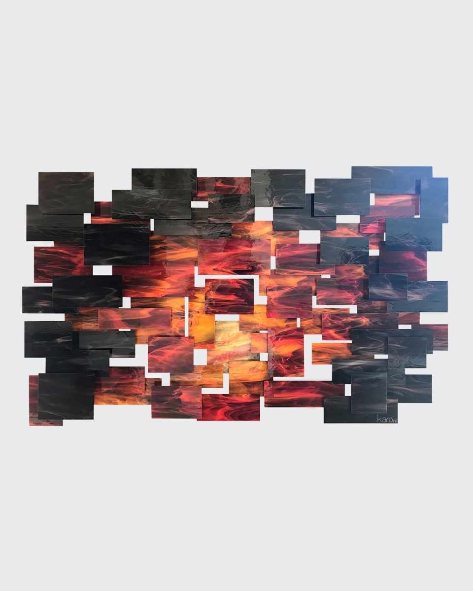 Dusk wall sculpture. Glass and metal. Overall: 58"W x 4"D x 36"T. Made in the USA. Boxed weight, approximately 40 lbs.
