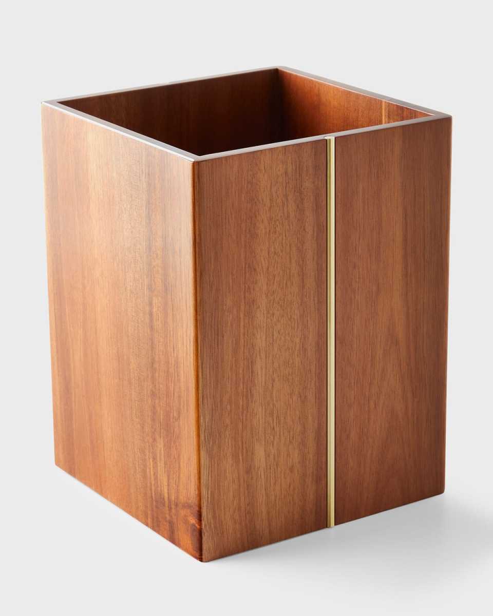 Acacia wood wastebasket with brass accents. Approx. 7.2"Sq. x 9.1"T Sold individually Hand wash Imported