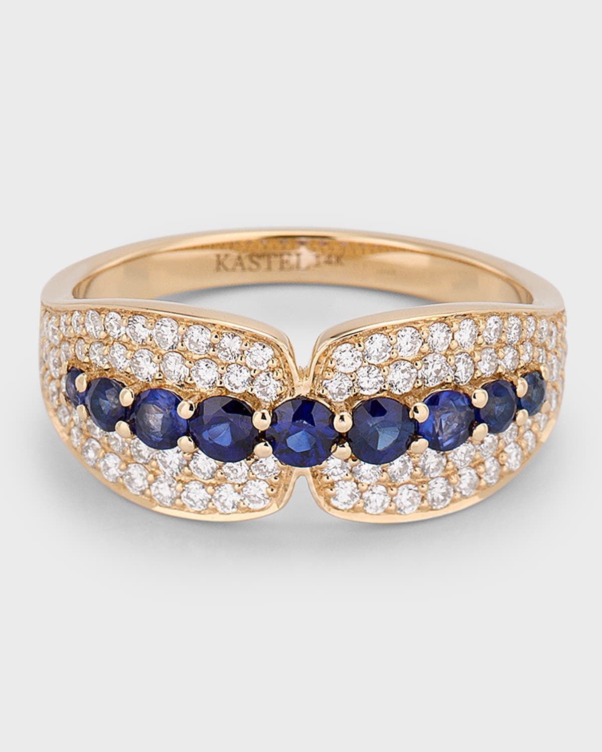Kastel Jewelry ring 14karat solid yellow gold White diamond pavé and graduating blue sapphires Diamond total carat weight: 0.58 Sapphire total carat weight: 0.61 Imported