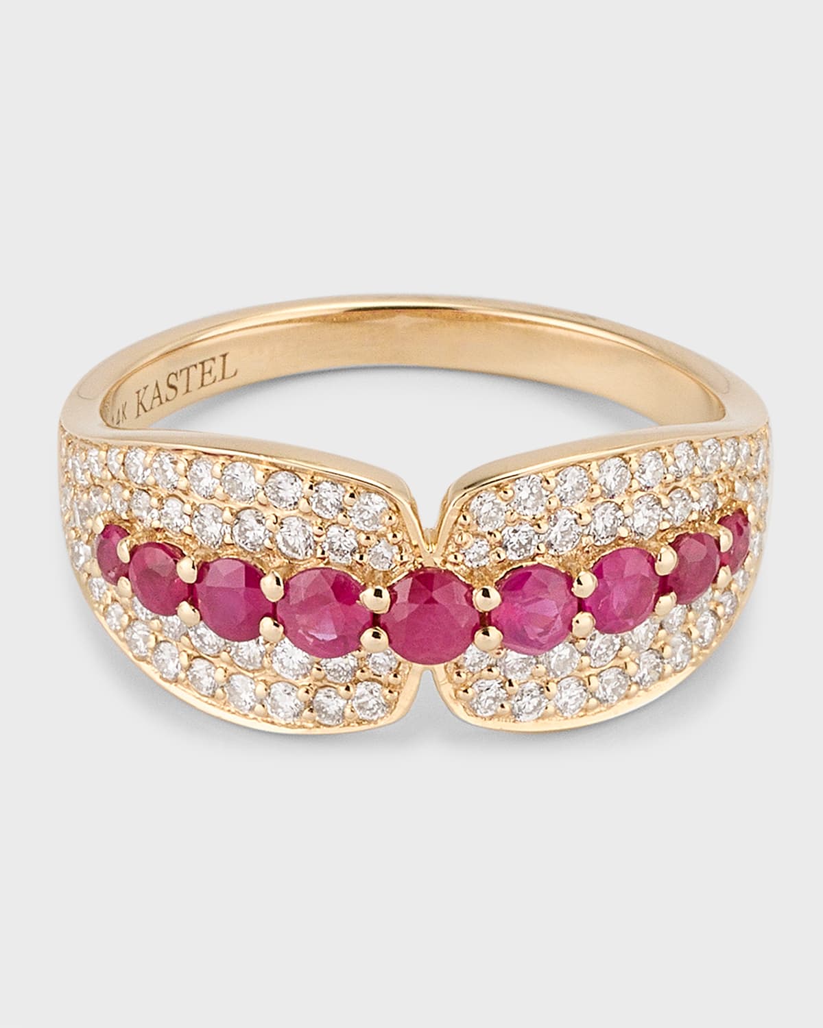 Kastel Jewelry ring 14karat solid yellow gold White diamond pavé and graduating red rubies Diamond total carat weight: 0.60 Ruby total carat weight: 0.58 Imported