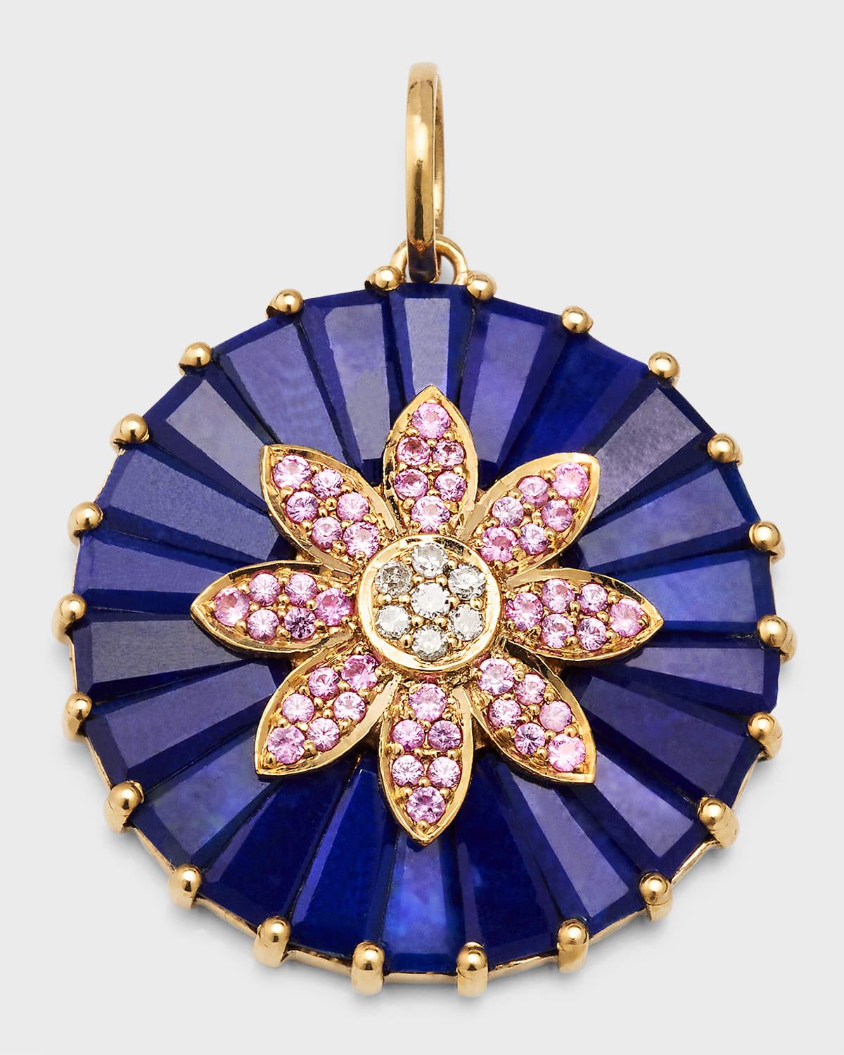 Kastel Jewelry pendant Approx. 1"L 14karat solid yellow gold Round white diamonds and pink sapphires Lapis lazuli gemstones Diamond total carat weight: 0.60 Sapphire total carat weight: 0.40 Necklace sold separately Imported