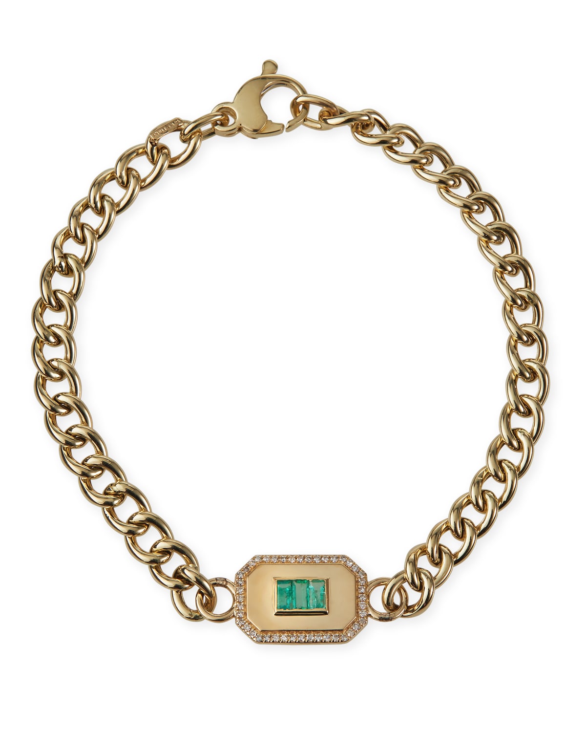 Kastel Jewelry chain bracelet. 14karat yellow gold hardware. Octagonal trim with diamonds. Center setting with emeralds. 0.34 total emerald carat weight. 0.14 total diamond carat weight. Lobster clasp. Imported.