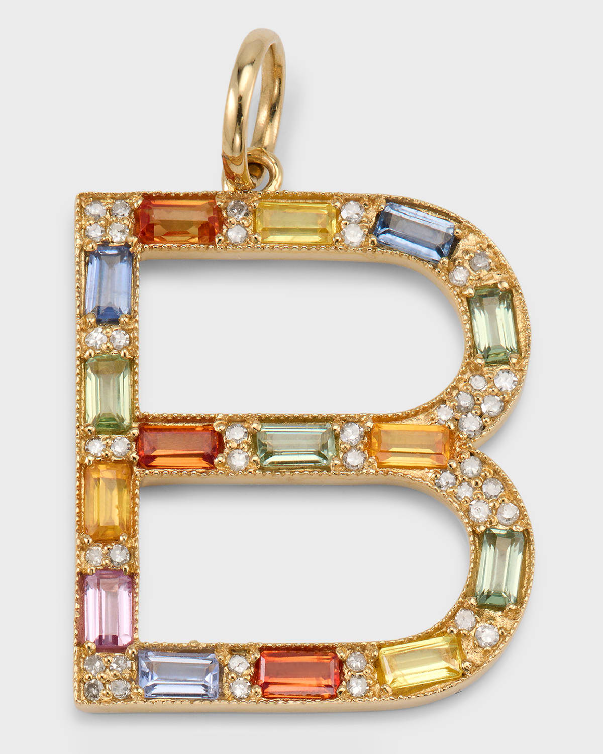 Kastel Jewelry initial B pendant 14karat yellow gold Multicolor baguette sapphires and round diamonds 0.12 total diamond carat weight 1.83 total sapphire carat weight Approx. 1.5"L Imported Necklace sold separately