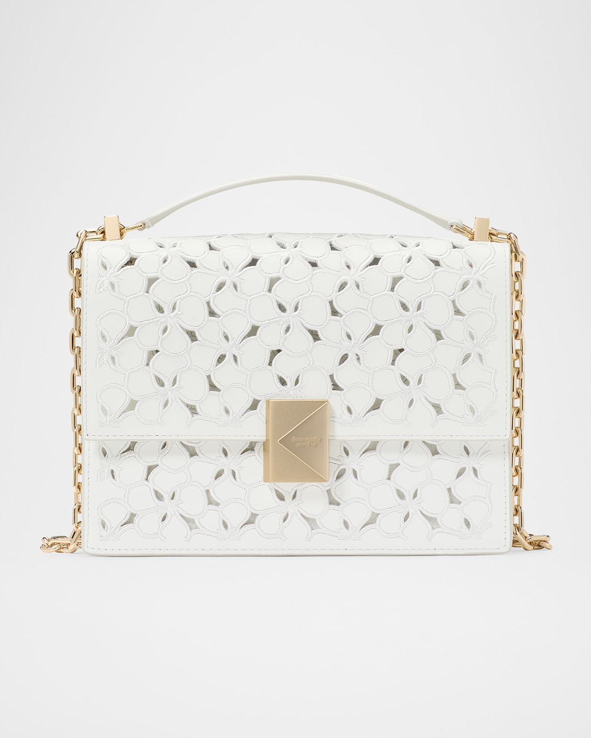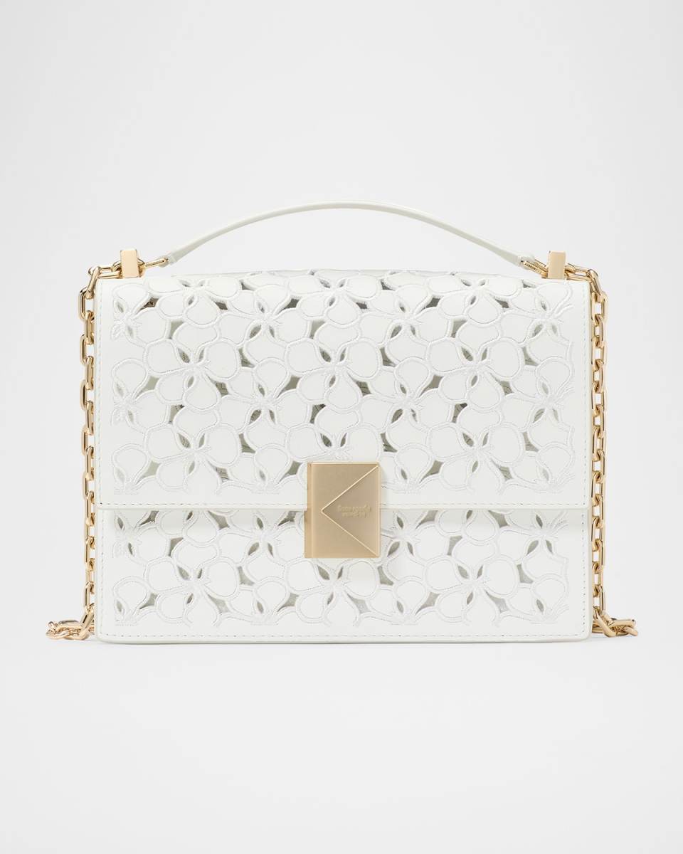 kate spade new york "Deco" shoulder bag in flower eyelet leather Sliding chain/leather shoulder strap Can be worn as a shoulder or crossbody bag Flap top with magnetic closure Interior, one slip pocket, one zip pocket Lining: Canvas Approx. 6.6"H x 9.1"W x 2.8"D Item Weight (Lbs.): 1.0 Spot clean Made in Italy
