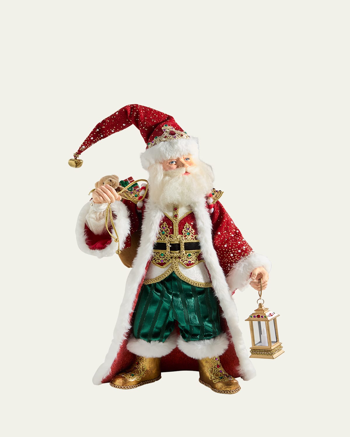 King Christopher Claus figurine holding a lantern made of resin, polyester, wool Artisan designed in Ohio by Katherine's Collection Limited quantity produced Indoor only Approx. 10.5"L x 10"W x 18"T Item Weight (Lbs.): 3.9 Imported