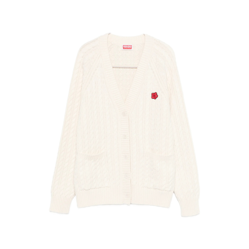 beige flower appliqué cable-knit V-neck front button fastening front patch pockets