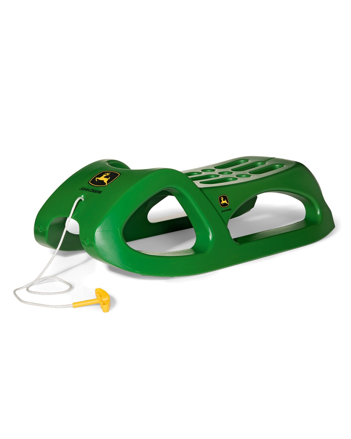 Kettler John Deere snow cruiser sled. This is a modern alternative to the classic wooden sled. It's made from a high polymer resin. It has stainless steel runners for excellent sledding properties in any kind of snow. 37" x 17.5" x 11". For ages 3 and up. Made in Germany.