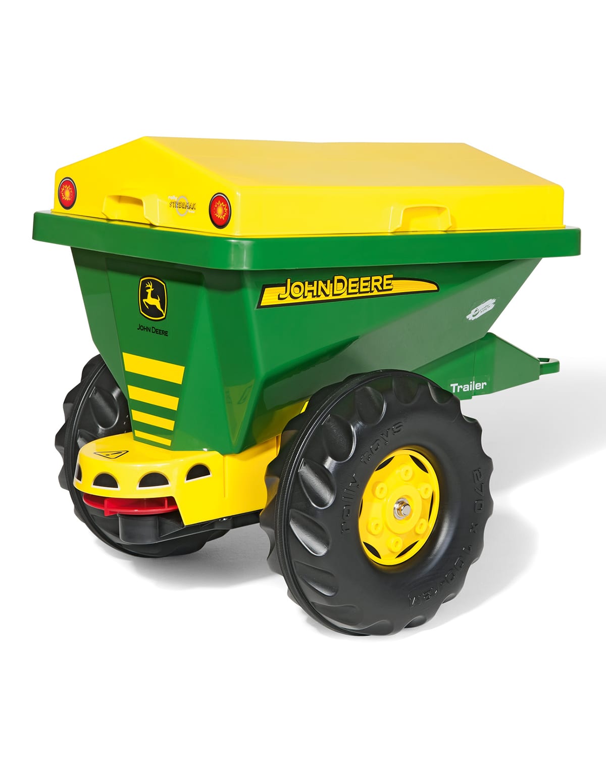 Kettler John Deere spreader trailer for kids. Fully functional rotating spreader disc driven from trailer wheels. Removable top. Includes a Universal Adapter that allows it to fit on the back of nonRolly manufactured tractors. For ages 5 years and up. Resin. Wipe down with wet washcloth. Approx. 27.5"W x 19"D x 19.5"T. Made in Germany.