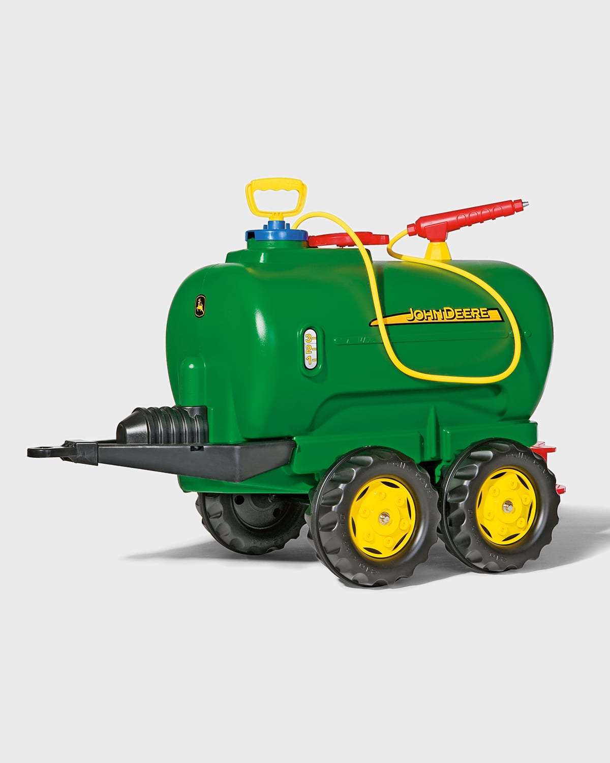 Kettler John Deere water tanker. This giant twin axle tanker is suitable for all the larger rolly Tractors. It has a top mounted filling lid with a removable pump. Pump the handle to activate the hand held spray nozzle. Includes a rear tap that allows water to be released in a fan spreading motion. Tanker holds up to 5 gallons of liquid. Includes a Universal Adapter that allows it to fit on the back of nonrolly manufactured tractors. For ages 5 years and up. Resin. Wipe down with wet washcloth. Approx. 39"W x 25"D x 18"T. Weighs 14 lbs. Made in Germany.