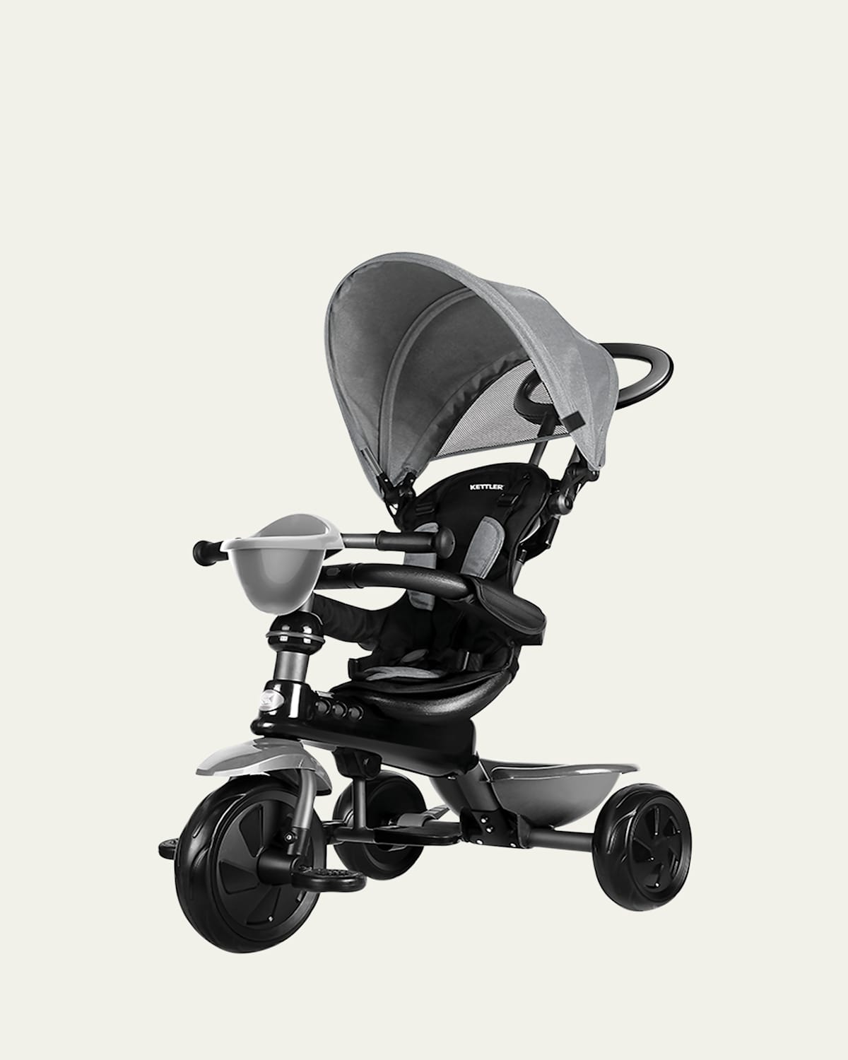 Kettler Happy Navigator 4in1 trike Grows with your little one from 10 to 72 months Transforms from parentcontrolled ride on to kids' tricycle Removable and adjustable features 4 stages to ease child into pedalling Front bottle holder basket and rear storage basket 5point safety harness Breathable seat cushion Removable backrest, foldable middle footrest, and nonslip pedals Front freewheel system with EVA wheels Extendable UVprotection canopy Adjustable parent handle Approx. 30"L x 20.5"W Item Weight (Lbs.): 18.0 Weight limit: 55lbs Recommended for ages: 10M+ Steel Imported