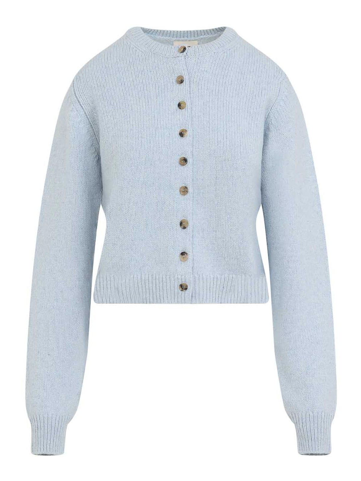 Cardigan Everheart bleu Khaite Atmosphere Cardigan bleu Pure Atmosphere Col rond boutonné, épaules tombantes, manches longues, poignets et ourlet côtelés, ourlet droit