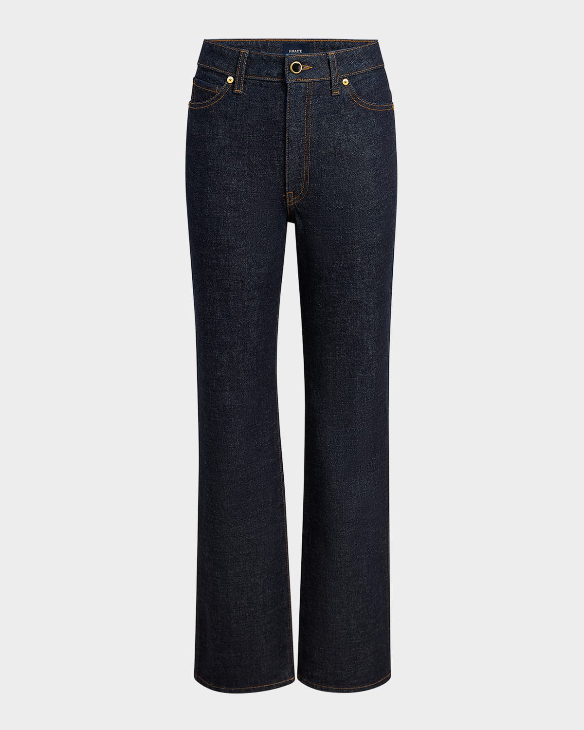 Khaite "Danielle" jeans are crafted of a dark wash denim with contrast stitching Mid rise sits high on hip Fivepocket style Straight legs Full length Button/zip fly; belt loops Cotton/polyurethane Dry clean Made in Italy