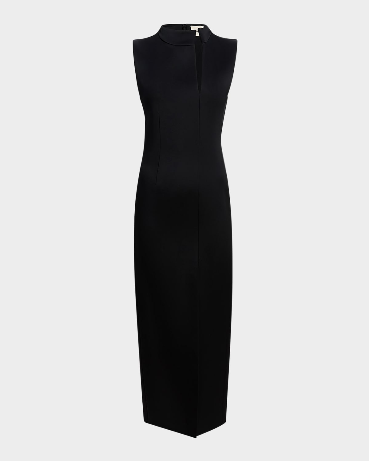 Khaite "Lowen" dress is crafted of crepe featuring asymmetric neck and hem slits Band collar; split V front Sleeveless Sheath silhouette Full length Side slit hem Invisible back zip Acetate/viscose Dry clean Made in Italy
