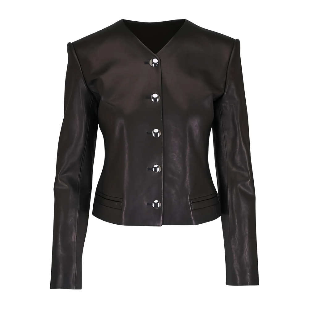 black button fastening V-neck shoulder pads long sleeves fitted silhouette