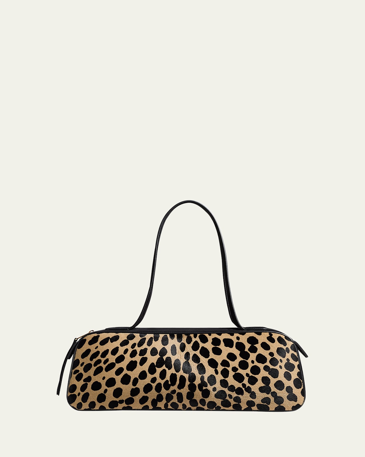 Take a step on the wild side with this "Simona" shoulder bag from Khaite, designed in smooth suede and bold dyed hyenaprint calf hair (Italy) with softly curving edges Flat shoulder straps Zip top closure Lining: Unlined Approx. 5"H x 14"W x 2.4"D Professional cleaning recommended Made in Italy
