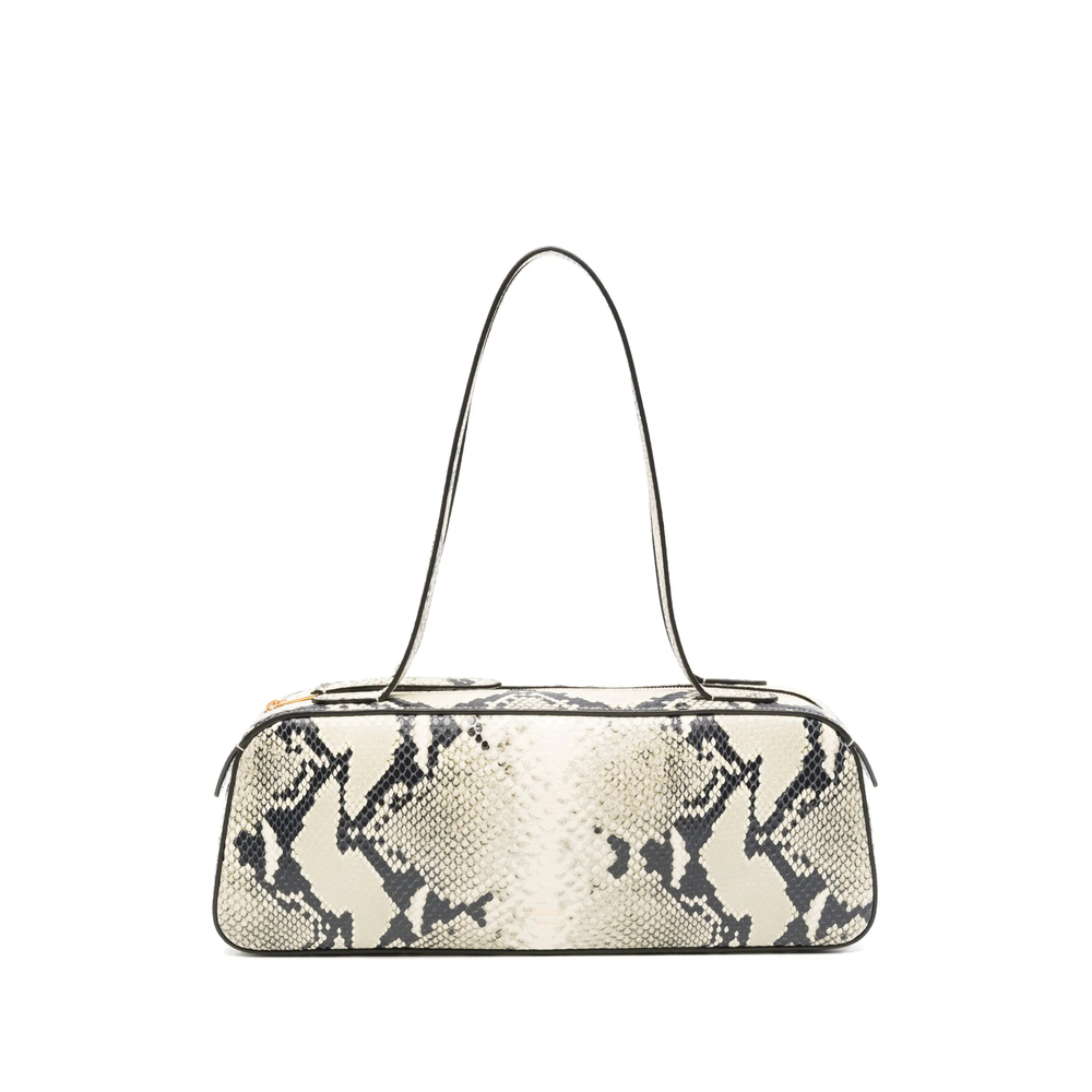 beige calf leather all-over snakeskin print contrasting trim two long top handles top zip fastening main compartment internal logo patch