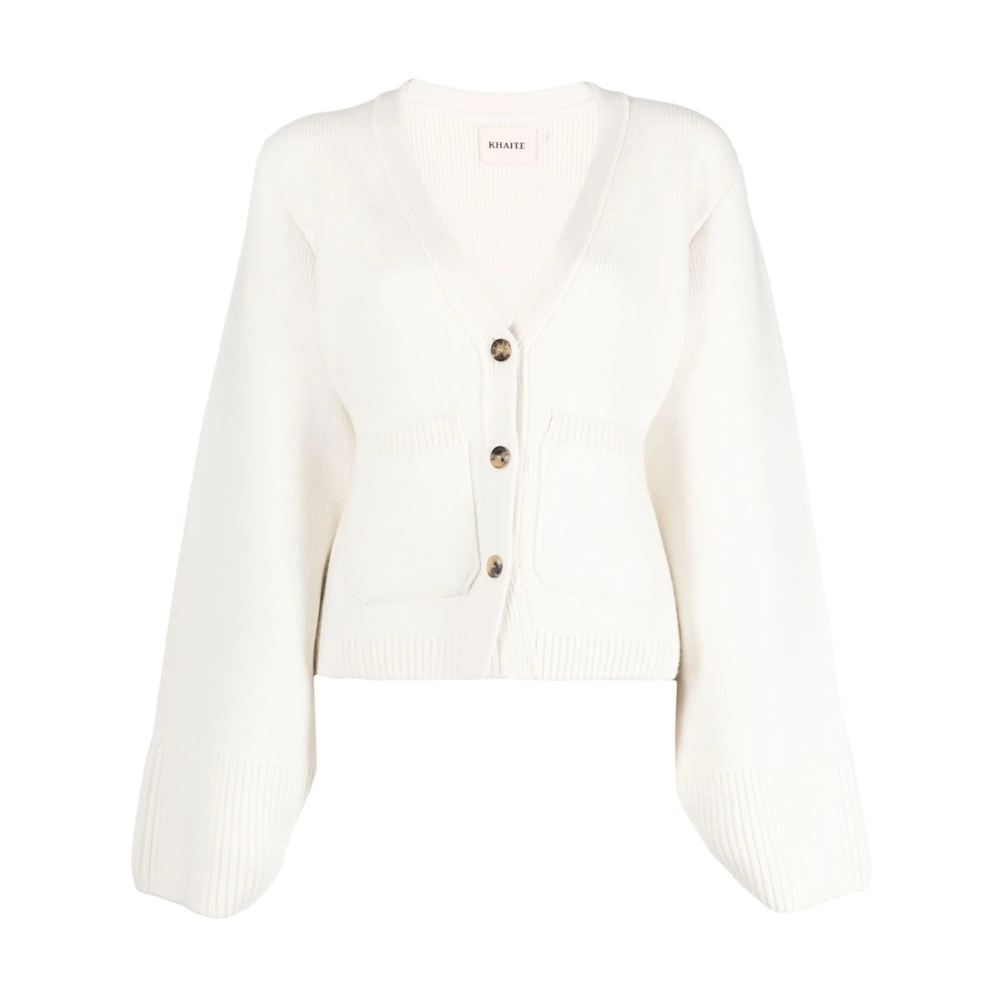 ivory white cashmere knitted construction two front pouch pockets front button fastening V-neck long sleeves ribbed trim