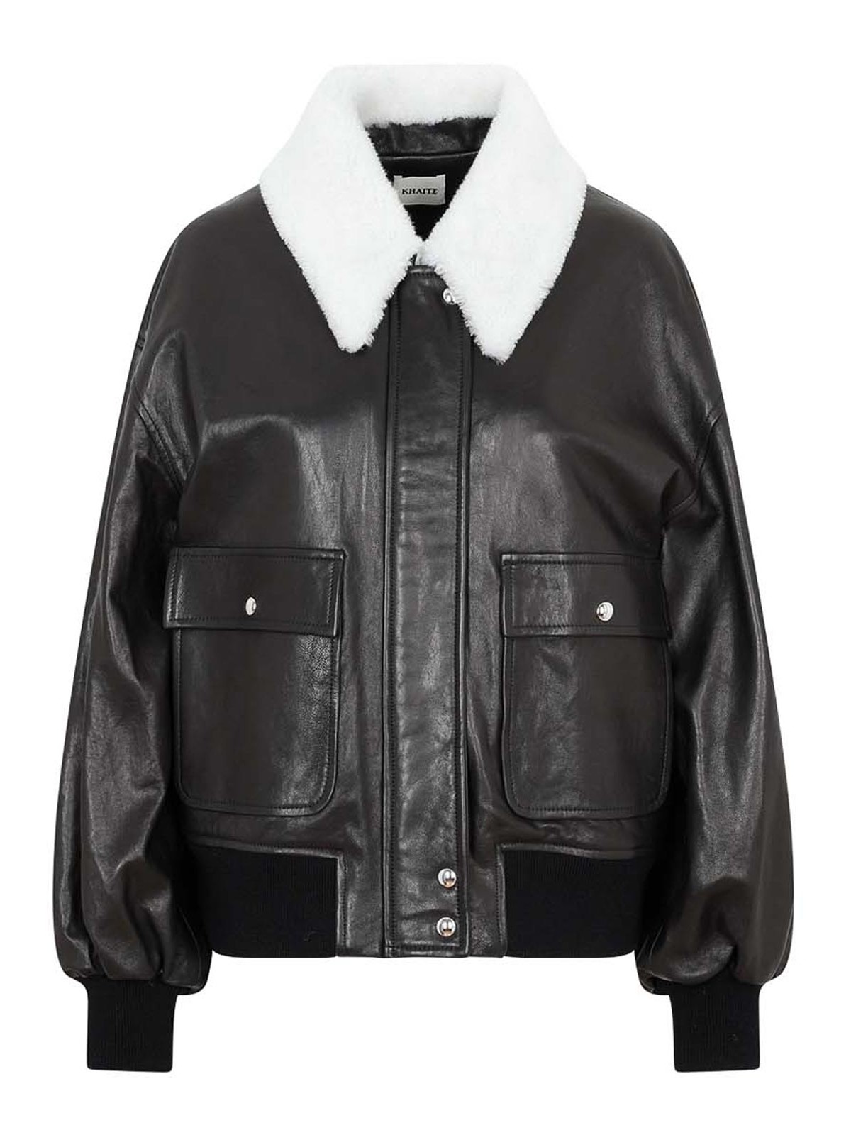 Veste noire Khaite shellar confectionnée en blanc pur, col en peluche surdimensionné, épaules tombantes dissimulées et manches ballon, poches à rabat, ourlet et poignets élastiqués