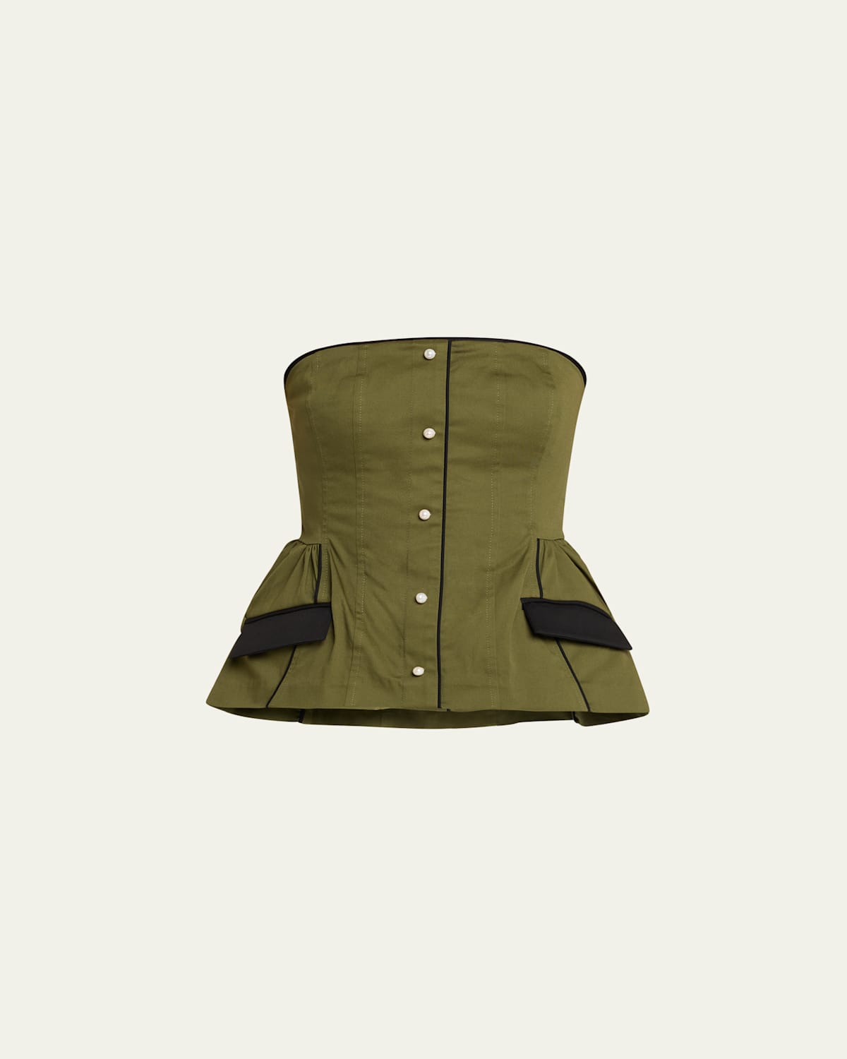Kika Vargas "Agnes" canvas top with contrast trim and decorative buttons Strapless neckline Sleeveless Fitted Faux flap pockets Back zip Cotton/elastane Dry clean, steam refresh only Made in Colombia