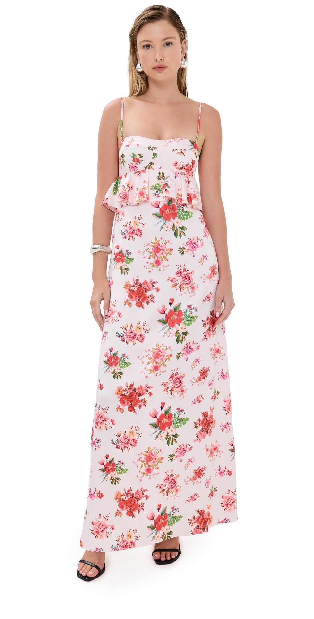 Fabric: Lightweight stretch satin. Corset inspired bodice with lace-up back. Empire waist with ruffle trim. Floral print. Sweetheart neckline. Adjustable shoulder straps. Hidden zip at back. On-seam side pockets. Shell: 95% polyester/5% elastane. Lined bodice, unlined skirt. Dry clean. Imported, Colombia. Measurements: Measurements from size S Length: 59in / 150.0cm, from shoulder