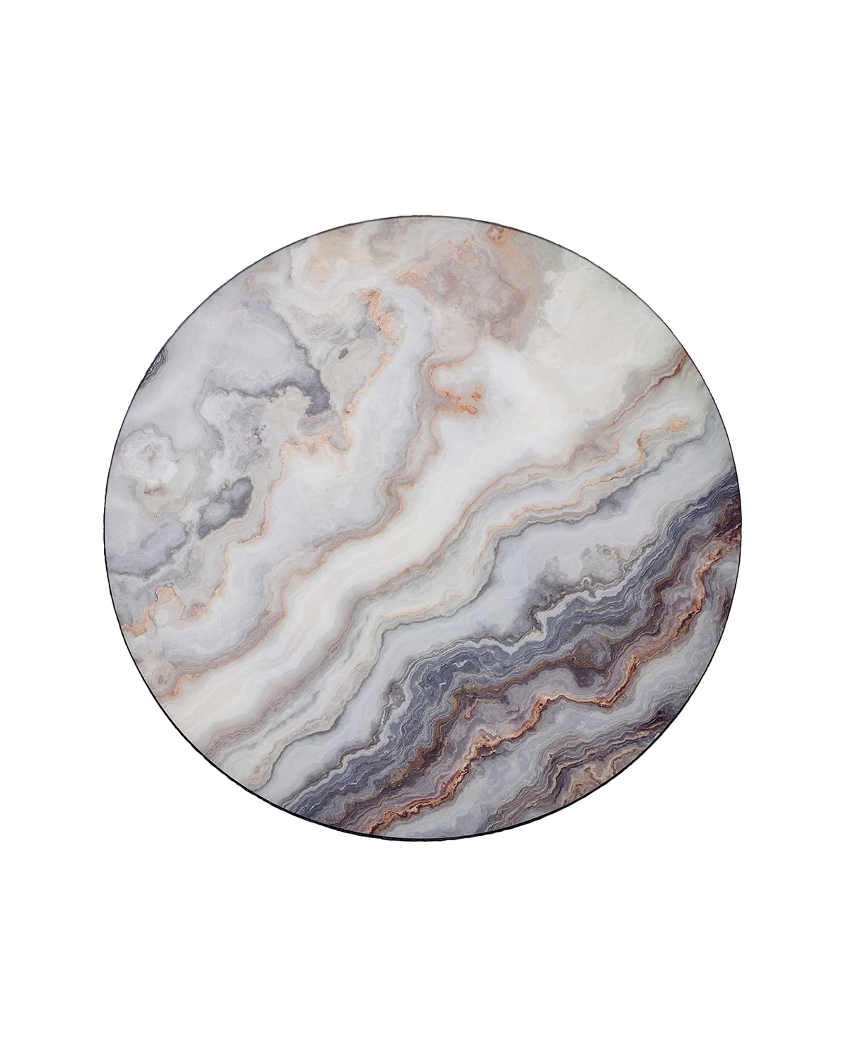 Round placemat with agate pattern. Wood composite, acrylic, and cork. Approx. 15"Dia. x 0.2T. Imported.
