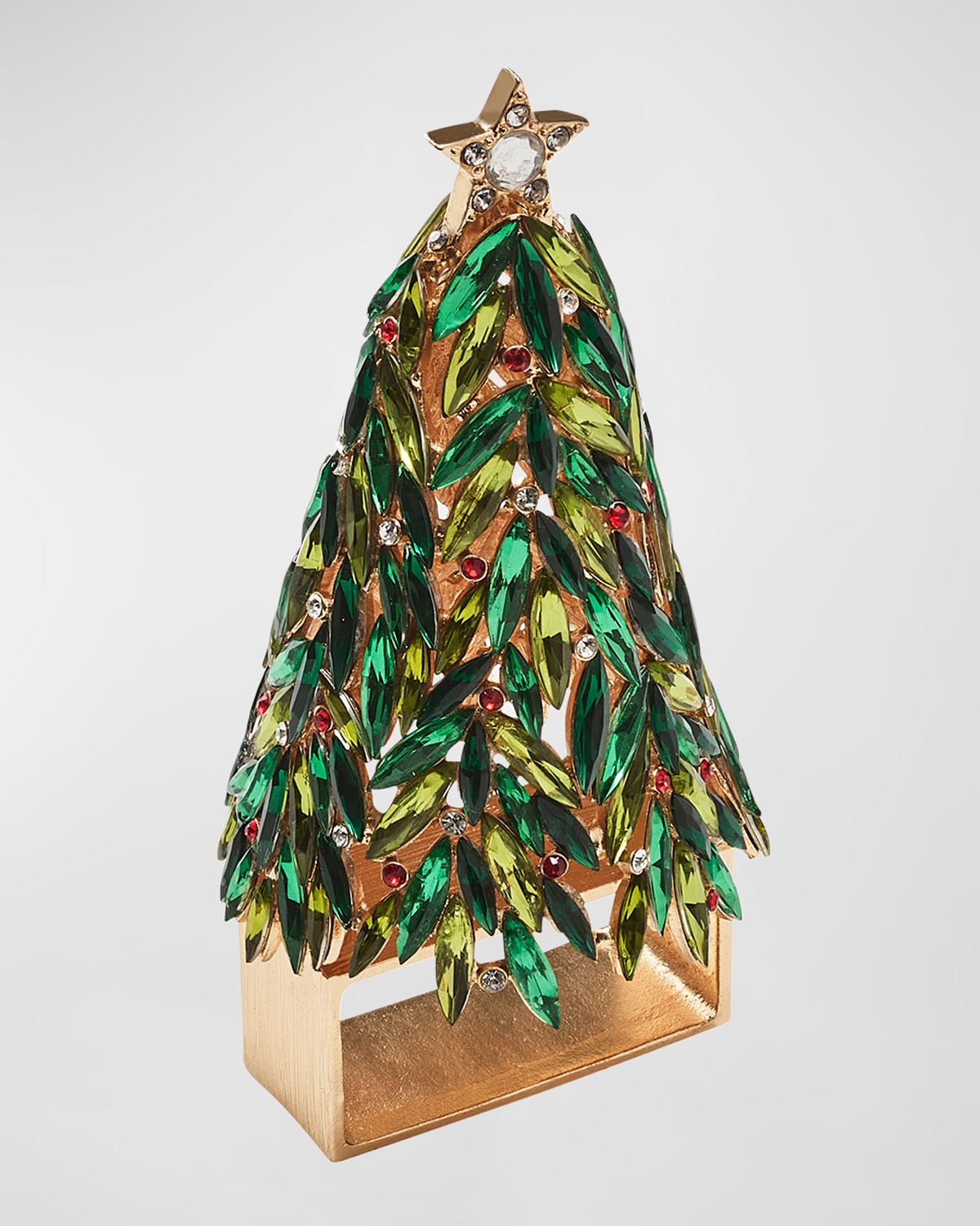 The enchanted Bejeweled Christmas Napkin Ring showcases a classic jeweled Christmas tree adorned with festive trimmings. Various green gemstone leaves decorate the coneshaped tree, while red baubles dance across its branches. Finished with a gemstone star topper, this iconic design adds the most festive touch to any Christmas table. Made of metal and glass Set of 4 Approx. 2.25"L x 2.3"W x 4.8"T Item weight, 0.3 lb Wipe clean Imported