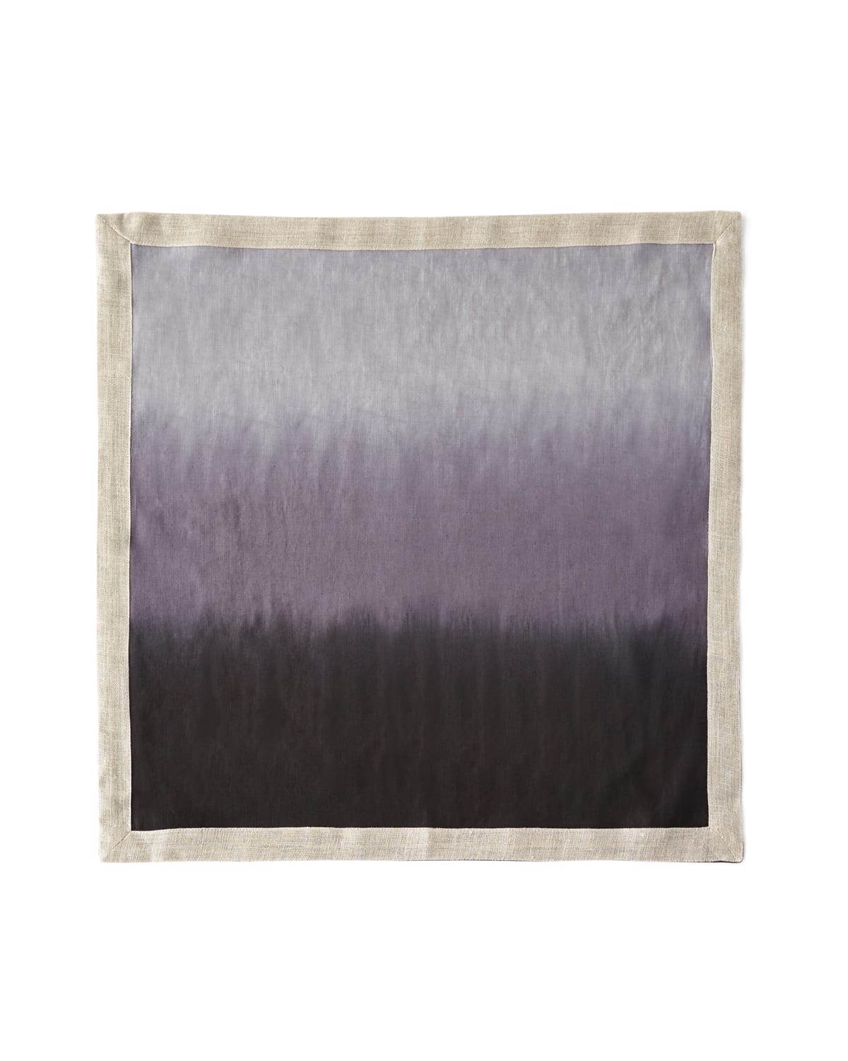 Dip dyed linen napkin with contrast border. Variations in density and depth of color are to be expected. Decorative dipdye napkin features an ombré gradation. Approx. 21"Sq. Hand wash or machine was on delicate cycle separately with mild detergent, machine dry low and remove promptly, steam iron while damp on reverse side. Do not bleach. Imported.