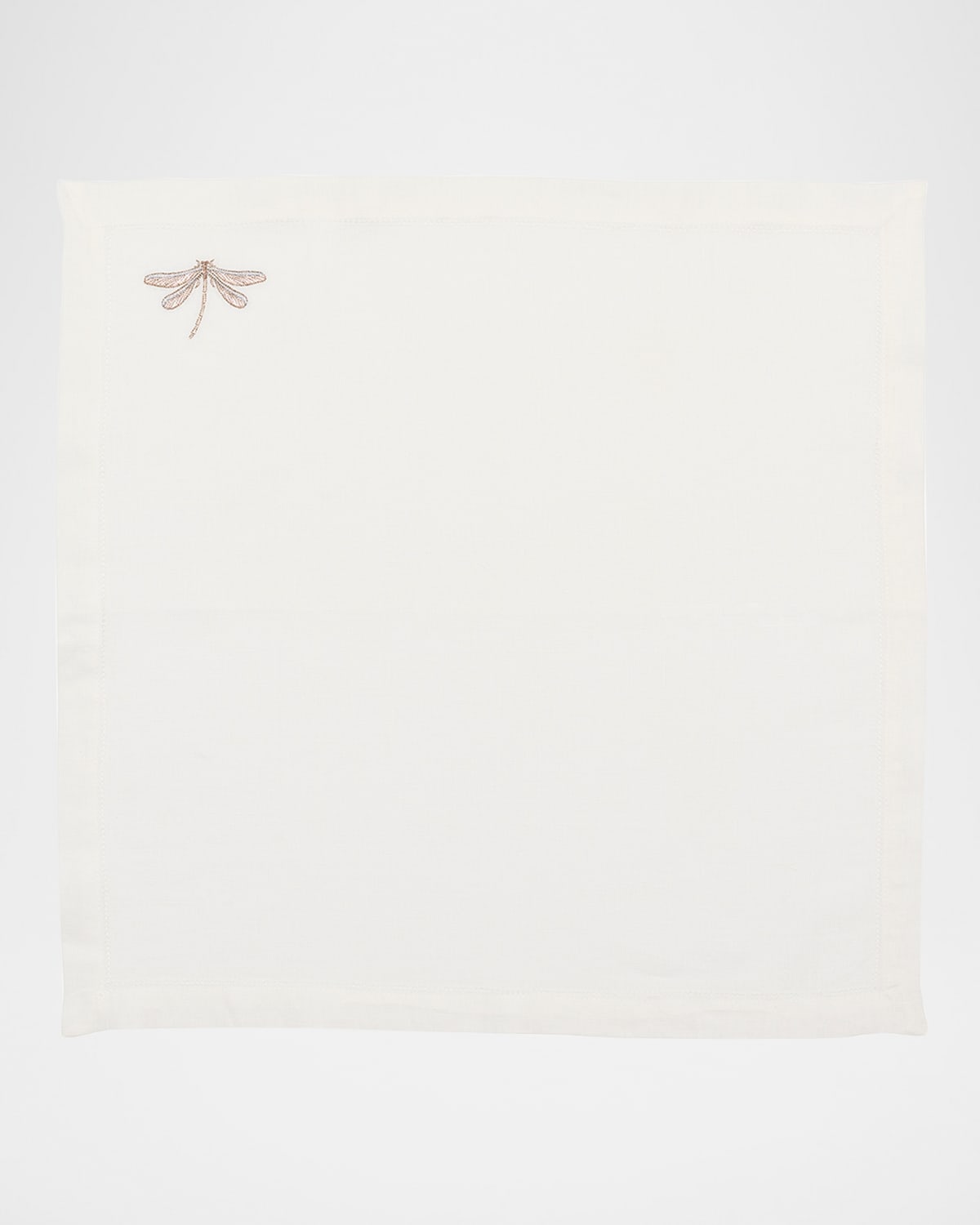 The dragonfly napkin delights with handembroidered motifs of these graceful dancers in flight. This uplifting linen accent makes an enchanting hostess gift and brings gardeninspired charm to your table. Made of linen Approx. 21"L x 21"W Do not dry clean. Machine wash cold with like colors. Machine dry low. Remove promptly. Steam iron while damp on reverse side. Do not bleach Imported