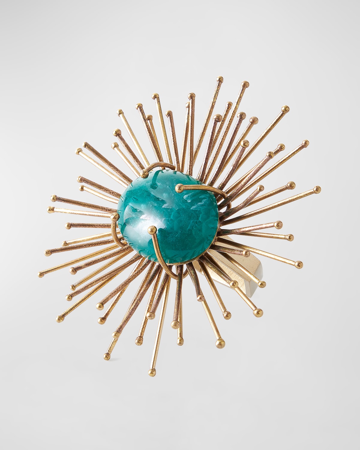 Never let it be said that a little drama is a bad thing, as in this solarflare napkin ring Brass spokes emanate from a resin center that mimics a malachite stone Approx. 4" x 3.75" x 2.5" Wipe clean Imported
