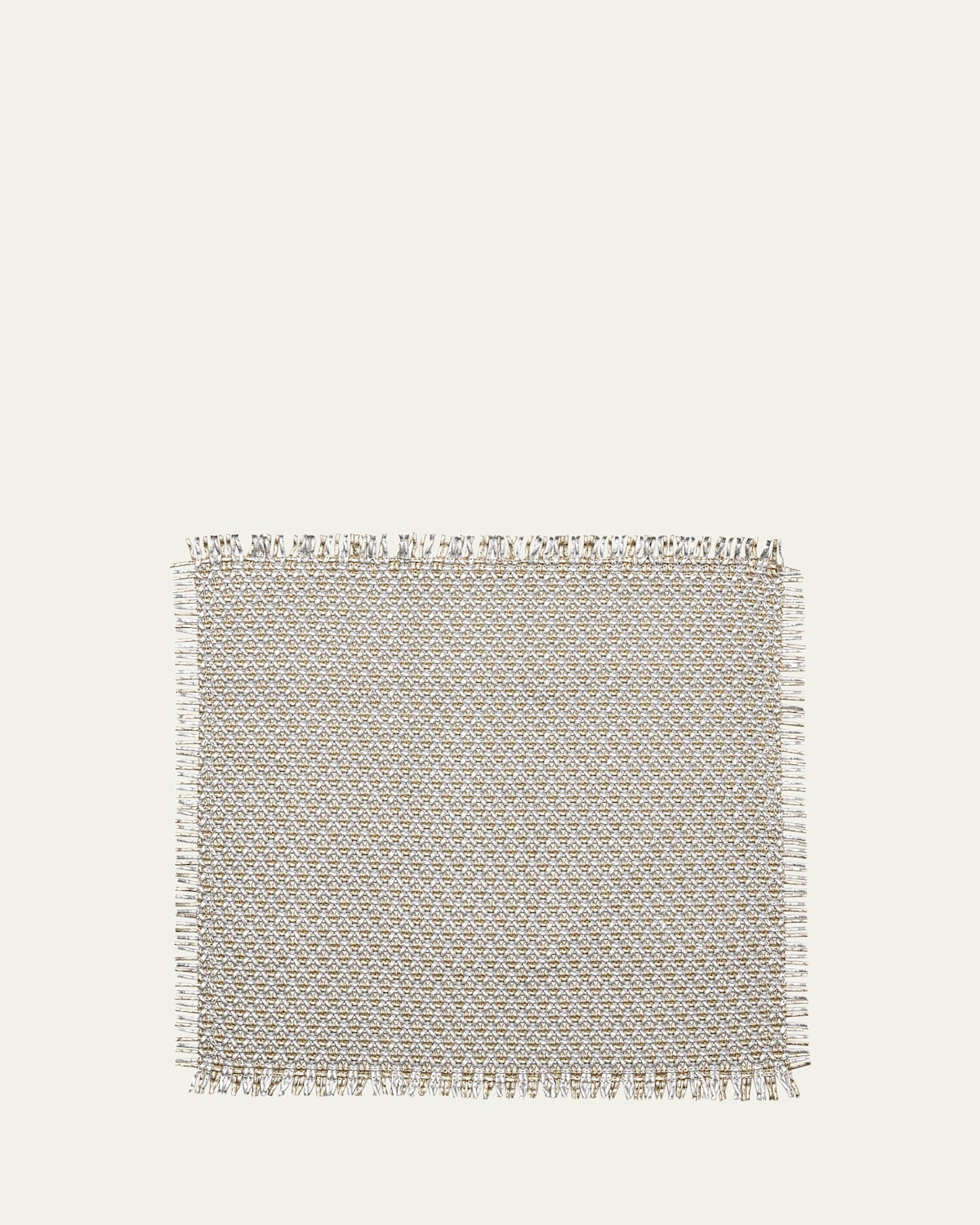 The Fringe Placemat boasts intricate gold and silver polyvinyl woven stripes that form an interlaced pattern, reminiscent of macrame. A fringe border adds movement and visual interest to this soft and pliable square placemat. It is versatile for both indoor and outdoor entertaining. Crafted of polyurethane Approx. 15"Sq. Wipe clean with a damp cloth Item Weight (Lbs.): 0.6 Imported