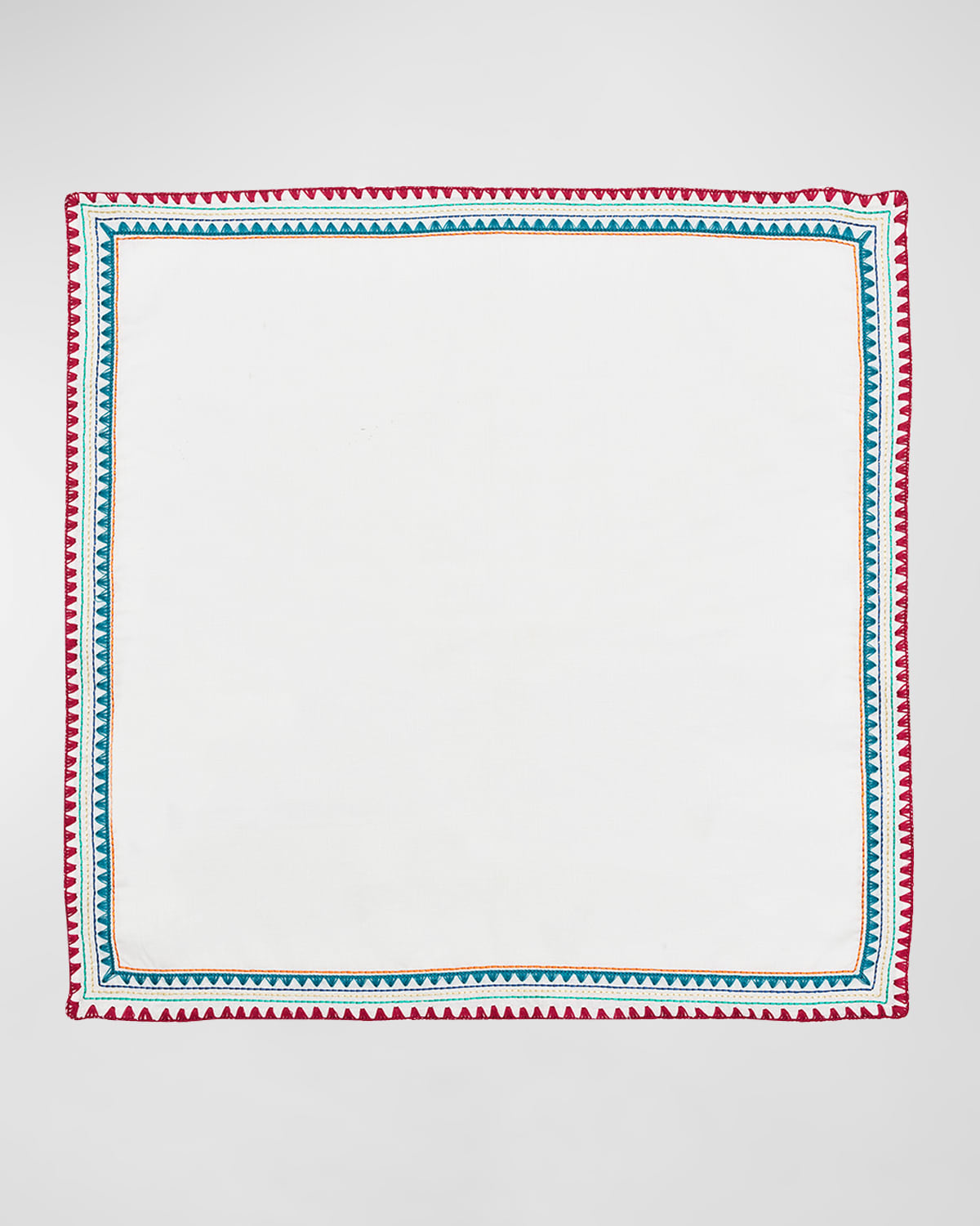 The festive Frolic Napkin features a vibrant, playful embroidered border in various bold colors. A combination of handcrocheted and machineembroidered techniques is used to create the colorful bands on it. Approx. 21"Sq. Linen Machine wash cold Imported