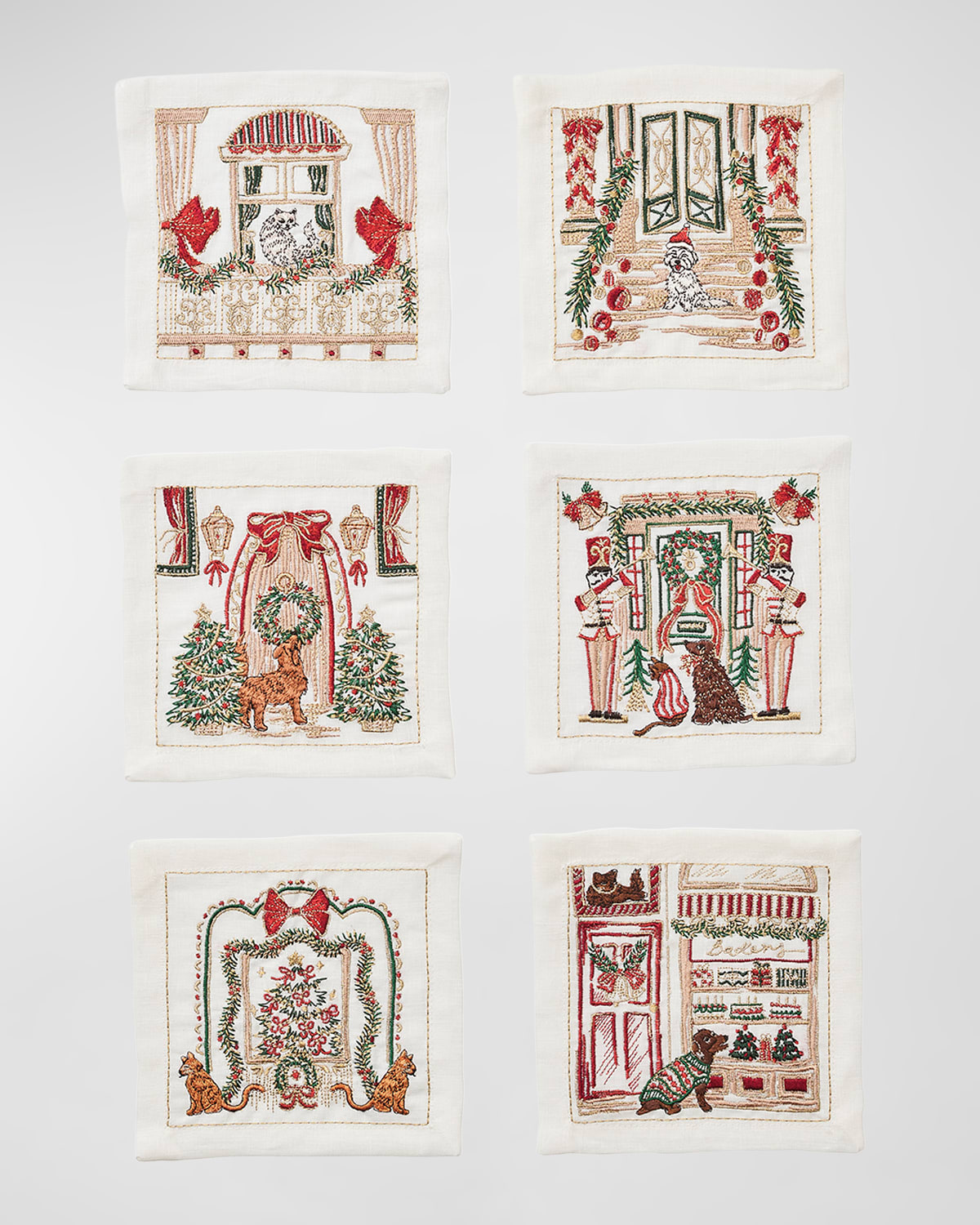 Capturing the essence of traditional Christmas decorating, the embroidered linen Holiday Paws Cocktail Napkins showcase adorned building facades with patiently waiting furry friends. The vibrant colors and detailed trimmings of the handdrawn imagery present six different scenes, all welcoming the Christmas spirit. These cocktail napkins are the perfect accessory for a festive holiday evening, adding a touch of charm and warmth to your holiday cocktail parties. Not to mention the perfect gift for pet lovers. Made of linen Assorted set of 6 Approx. 6"sq. Item weight, 0.3 lb Machine wash cold Imported