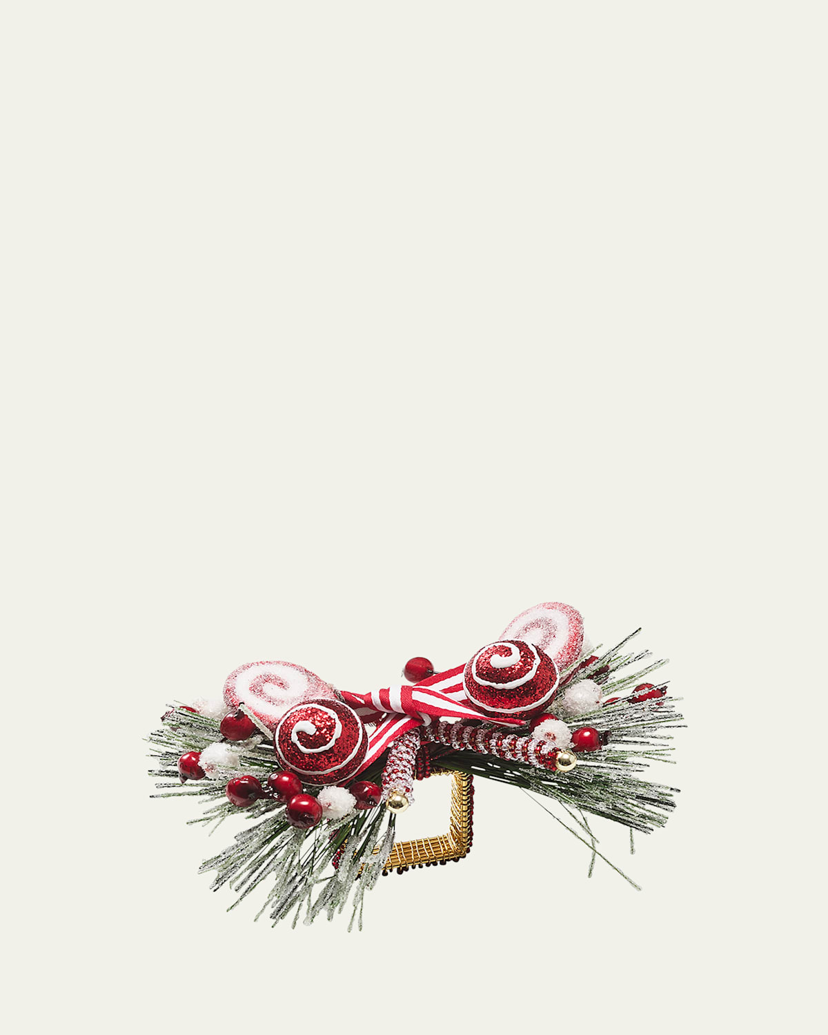 Add a touch of holiday sparkle and joy with the whimsical Holiday Twist Napkin Ring. Crafted by hand, this festive napkin ring features traditional red and white beaded candy, pinecones, faux berries, and frosted branches. The holiday mix evokes the nostalgia of a wintry Christmas morning, setting the stage for a cheerful celebration. Made of plastic, glass, and metal Approx. 6"L x 4.0"W x 3.5"T Item weight, 0.2 lb Wipe clean Imported