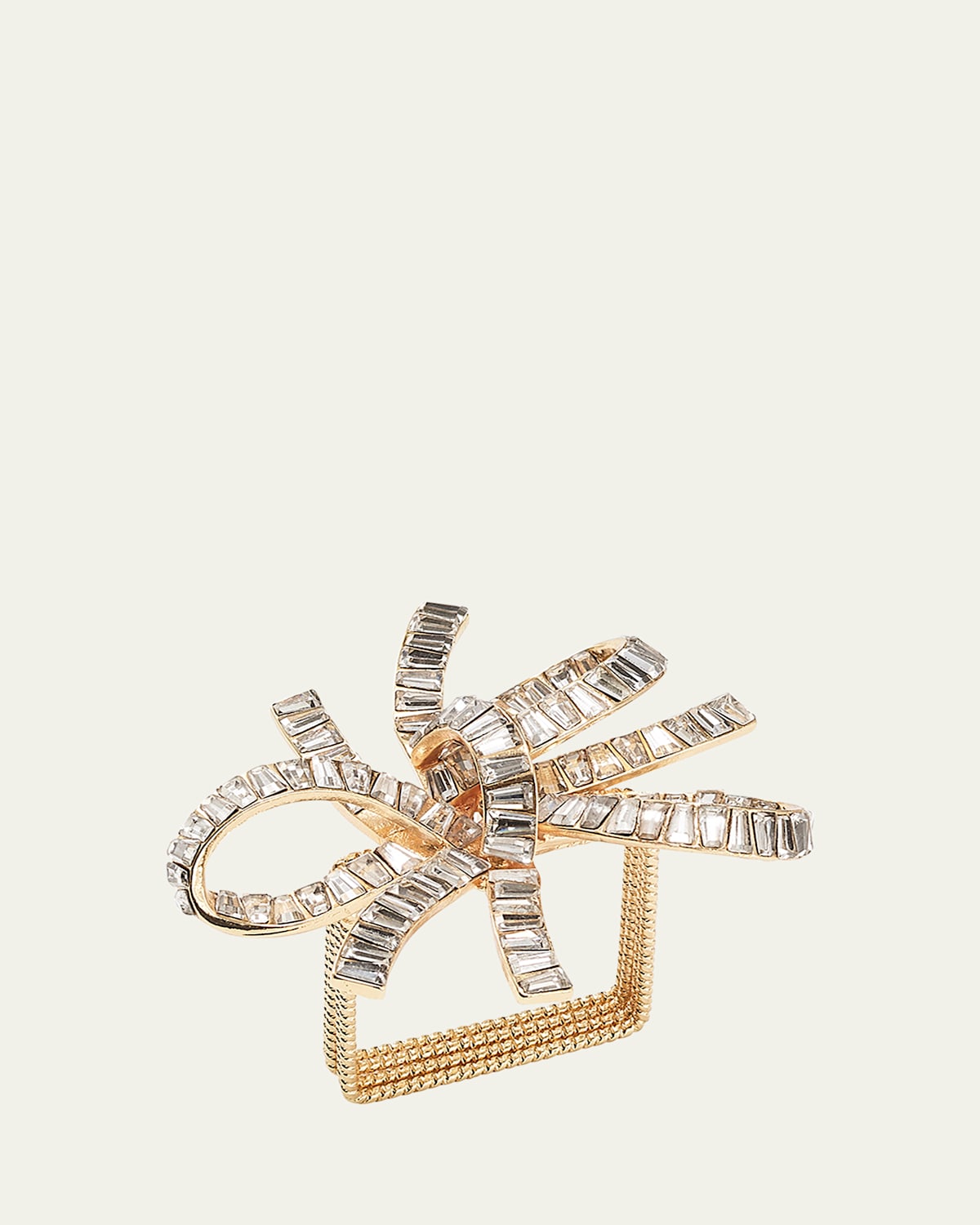 Napkin rings adorned with a jeweled bow Made of metal and glass Set of four Approx. 2.6"L x 2.2"W x 2.2"T Wipe clean Imported