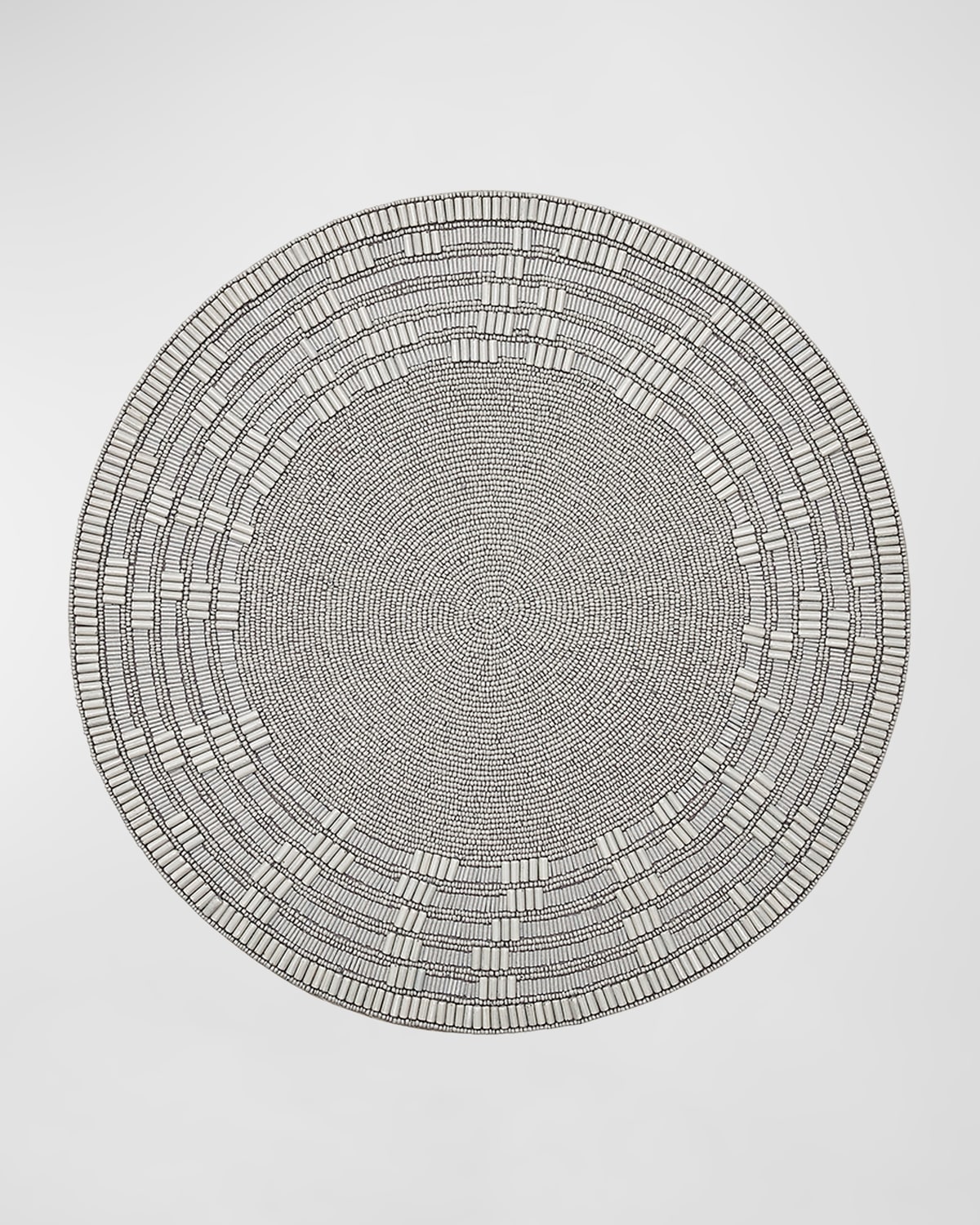The artisanal Matrix Placemat is handcrafted using captivating gray glass beads. This unique beadwork gives the placemat a ceramiclike appearance. Beads of varying heights create an engaging high and loweffect on a ringed border. This textured border features a captivating, repeated pattern. The transitional Matrix Placemat combines style and function for spring and summer entertaining. Crafted of glass and plastic beads on cotton backing Approx. 15"Dia. Item Weight (Lbs.): 1.2 Wipe clean Imported