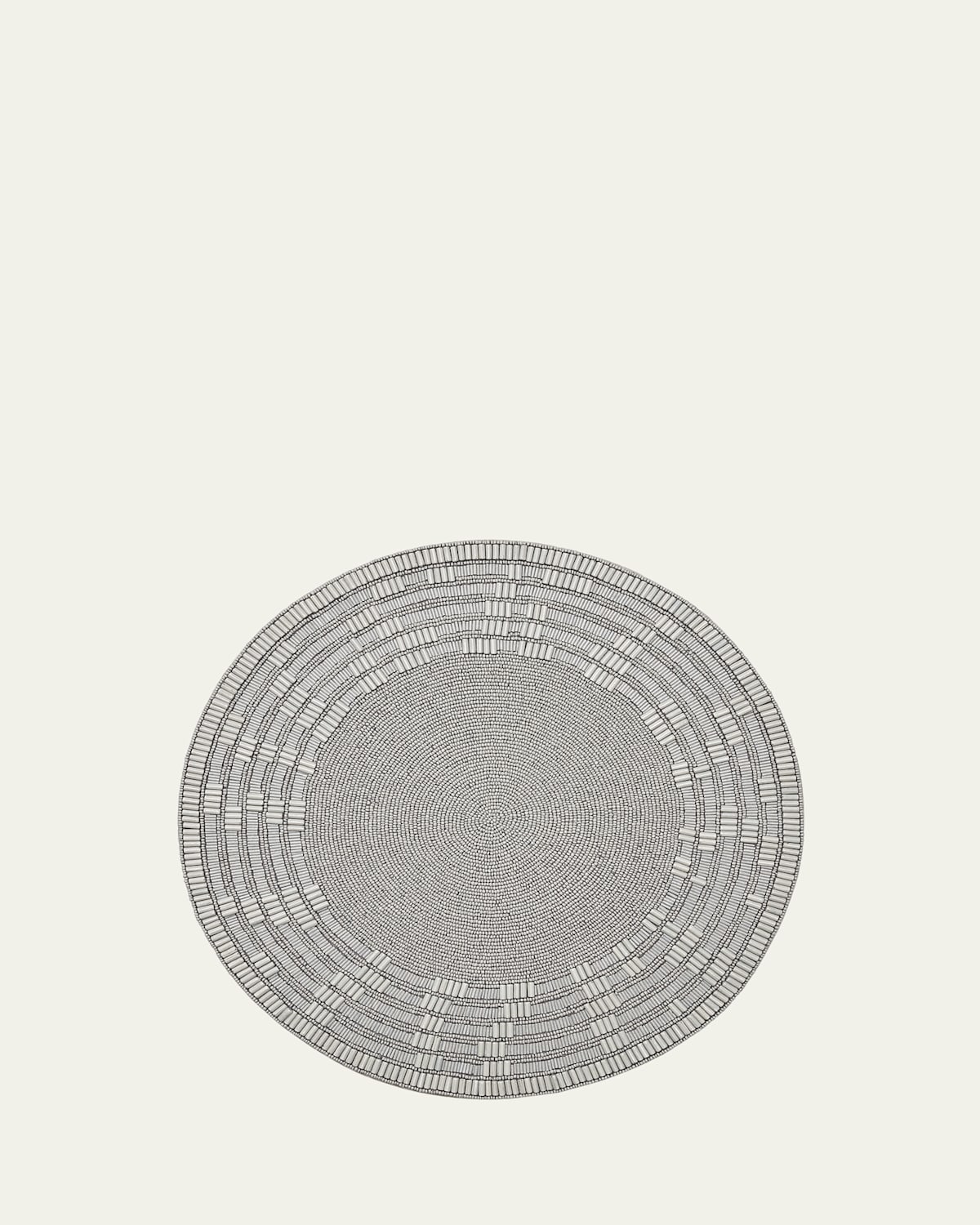 The artisanal Matrix Placemat is handcrafted using captivating gray glass beads. This unique beadwork gives the placemat a ceramiclike appearance. Beads of varying heights create an engaging high and loweffect on a ringed border. This textured border features a captivating, repeated pattern. The transitional Matrix Placemat combines style and function for spring and summer entertaining. Crafted of glass and plastic beads on cotton backing Approx. 15"Dia. Item Weight (Lbs.): 1.2 Wipe clean Imported