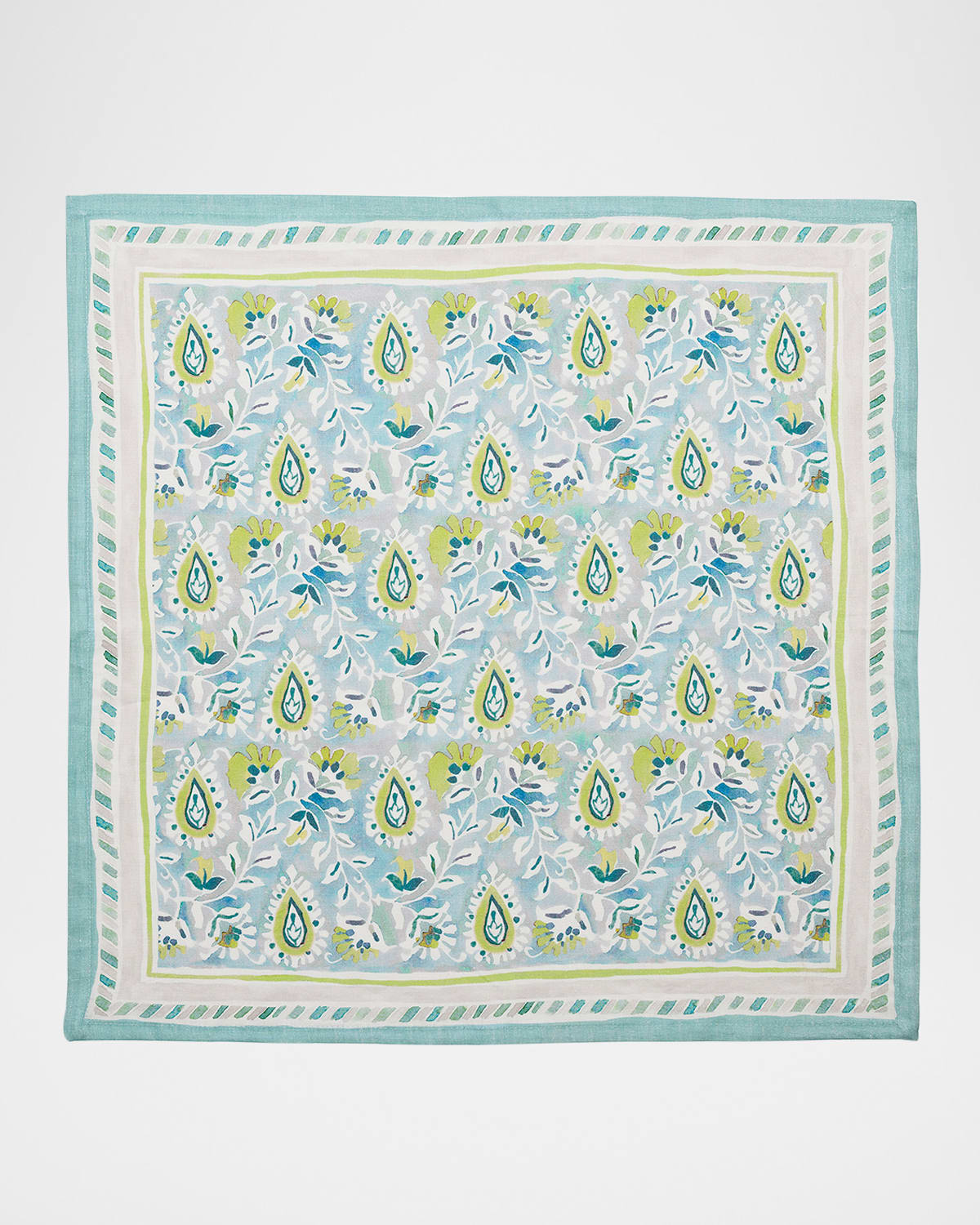 The Mira Napkin showcases handpainted paisley patterns on luxurious linen. The bold backdrop illustrates natureinspired vine motifs, accented by fresh pops of green and seaform shades. From garden parties to bridal showers, this napkin sets the tone for any occasion. Made of linen Approx. 21"Sq. Machine wash cold Imported