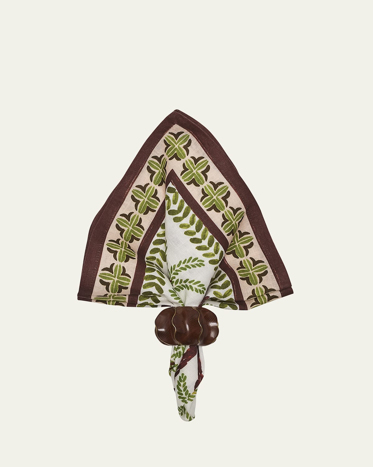 Set the stage for a splendor in paradise feast with the Oasis napkin. Swaying palms of various heights with a border of stylized quatrefoils were first handpainted and then subsequently printed into the napkin. Green and chocolate brown hues instantly give off island style. Fold and flare this napkin around the many tropicsinspired napkin rings from Kim Seybert's collection. Crafted of linen Approx. 21"Sq. Item Weight (Lbs.): 0.2 Machine wash Imported