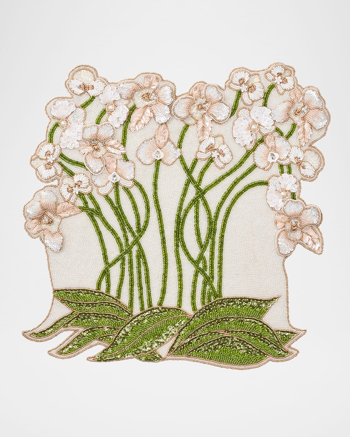 The Orchid Placemat creates a sense of occasion for every celebration. This captivating display of beads, sequins, and faux pearls and gems presents a vivid orchid show with threedimensional details that spark guests' imaginations. Add a dazzling napkin ring (sold separately) for the grand finale to this remarkable setting. Crafted of glass, plastic, and metal on cotton Approx. 15.25"Sq. Item Weight (Lbs.): 1.0 Spot clean Imported