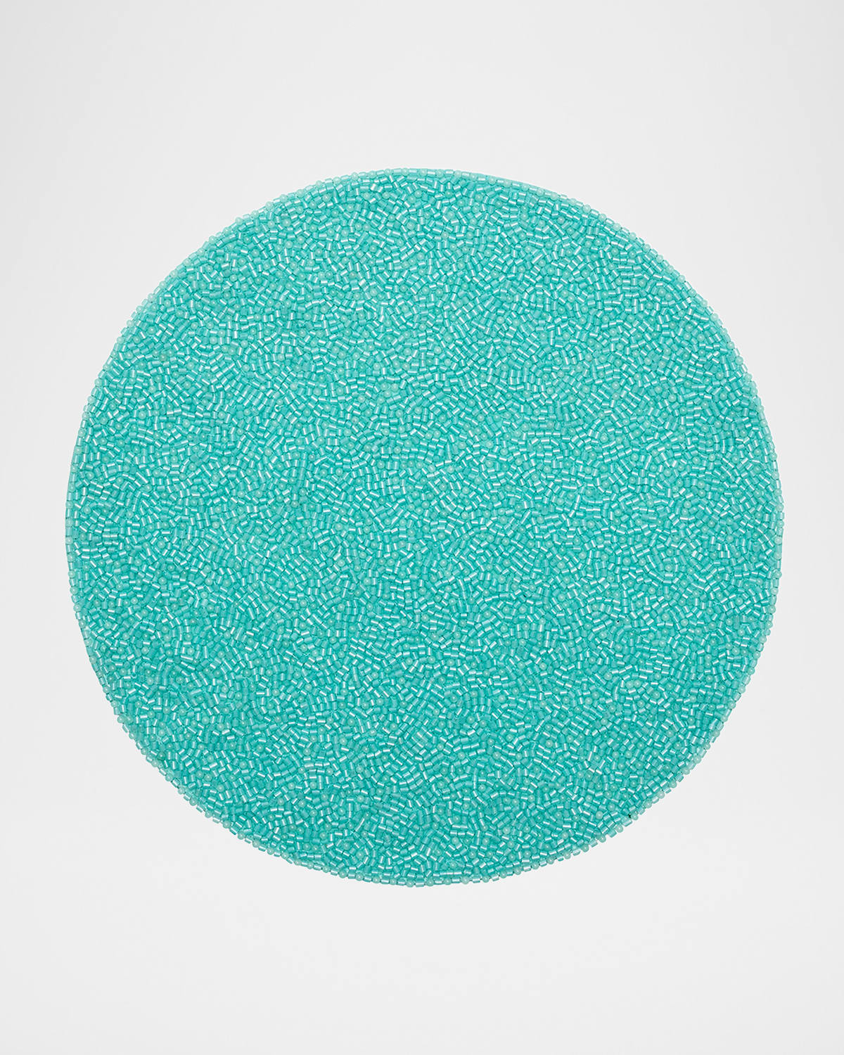 The Perennial Placemat features freeflowing translucent turquoise beads in vermicelli patterns filled with understated sophistication. Effortlessly restyle this setting with enduring elegance, season after season. Crafted of glass beads on cotton Approx. 15"Dia. Item Weight (Lbs.): 1.0 Spot clean Imported