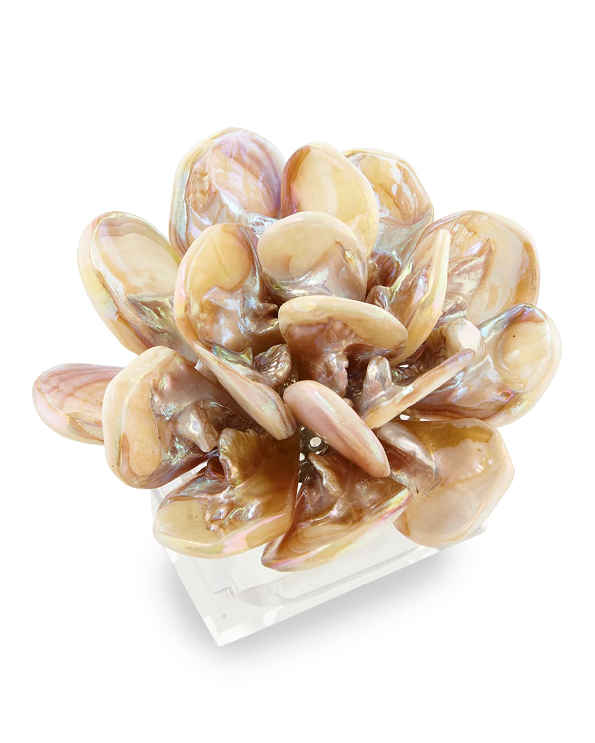 Acrylic napkin ring with fresh river shell cluster on top. Iron hardware. Approx. 3"Dia. x 3.25"T. Wipe clean with a dry cloth. Imported.